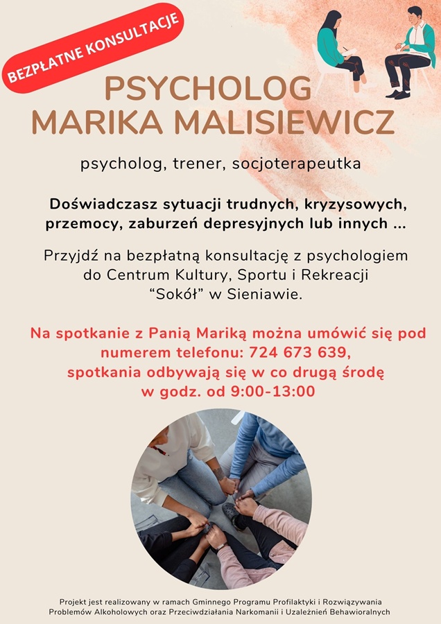 Bezpłatnych konsultacji dla dzieci i młodzieży z terenu Miasta i Gminy Sieniawa udziela psycholog Marika Malisiewicz.
