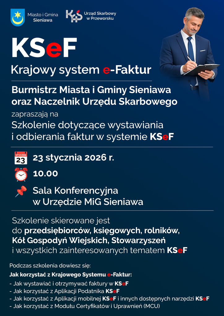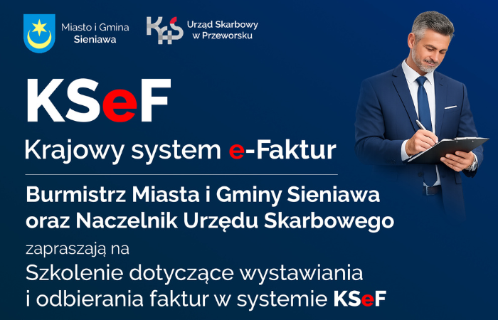 Burmistrz Miasta i Gminy Sieniawa oraz Naczelnik Urzędu Skarbowego zapraszają na szkolenie dotyczące wystawiania i odbierania faktur w systemie KSeF.