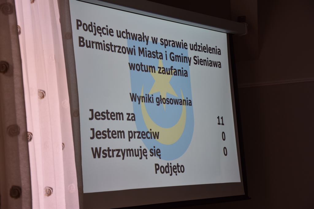 Po przeprowadzeniu debaty, Rada Miejska w Sieniawie podjęła uchwałę w sprawie udzielenia wotum zaufania Burmistrzowi Miasta i Gminy Sieniawa Adamowi Wosiowi.