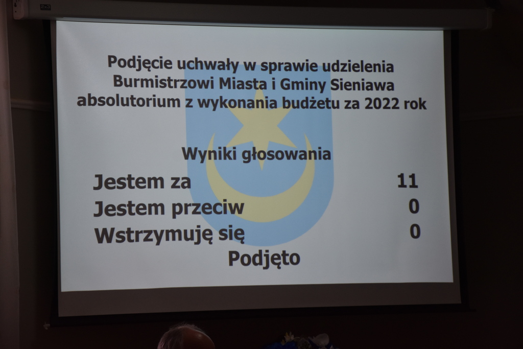 Komisja Rewizyjna Rady Miejskiej w Sieniawie postanowiła pozytywnie ocenić zarówno sprawozdanie z wykonania budżetu za 2022 rok, jak i sprawozdanie finansowe. Podkreśliła również, że przedłożone sprawozdania zostały sporządzone prawidłowo pod względem formalno-rachunkowym i rzetelnie odzwierciedlają stan finansów gminy. Mając na uwadze te informacje, 11 obecnych radnych jednogłośnie zagłosowało za udzieleniem Burmistrzowi Miasta i Gminy Sieniawa absolutorium z wykonania budżetu za 2022 rok. Jest to 17 absolutorium udzielone Adamowi Wosiowi w trakcie sprawowania urzędu Burmistrza Miasta i Gminy Sieniawa. Przewodnicząca Rady Miejskiej Danuta Król złożyła gratulacje burmistrzowi i wręczyła kwiaty.