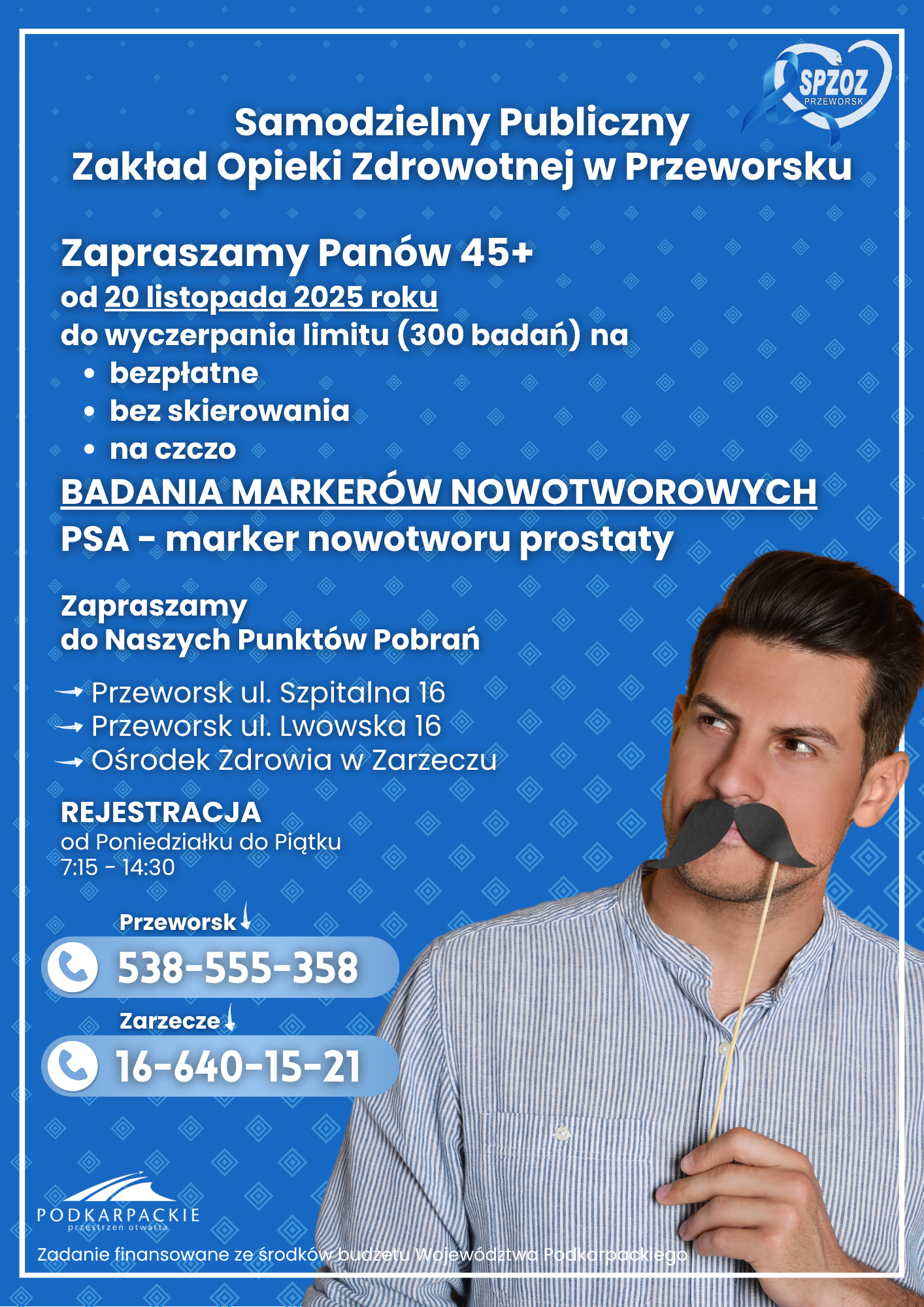 Samodzielny Publiczny Zakład Opieki Zdrowotnej w Przeworsku zaprasza Panów 45+ od 20 listopada 2025 roku do wyczerpania limitu (300 badań) na BEZPŁATNE BEZ SKIEROWANIA NA CZCZO BADANIA MARKERÓW NOWOTWOROWYCH PSA (marker nowotworu prostaty).