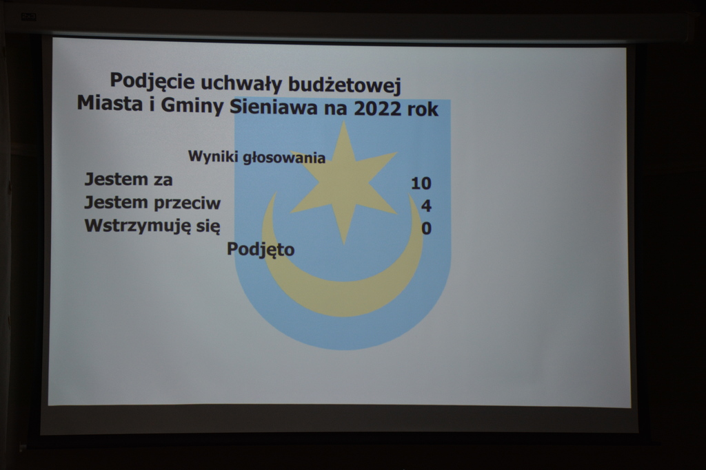 Uchwała budżetowa została przyjęta 10 głosami „za” i 4 „przeciw”. Rada podjęła jednocześnie uchwałę w sprawie uchwalenia Wieloletniej Prognozy Finansowej Miasta i Gminy Sieniawa na 2022 rok – 10 głosami „za”, 3 „przeciw” i 1 wstrzymującym się.