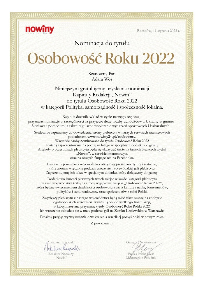 11 stycznia redakcja „Nowin” ogłosiła tegoroczne nominacje do tytułu Osobowość Roku. Burmistrz Miasta i Gminy Sieniawa Adam Woś otrzymał nominację Kolegium Redakcyjnego do tytułu Osobowość Roku 2022 w kategorii Polityka, samorządność i społeczność lokalna.