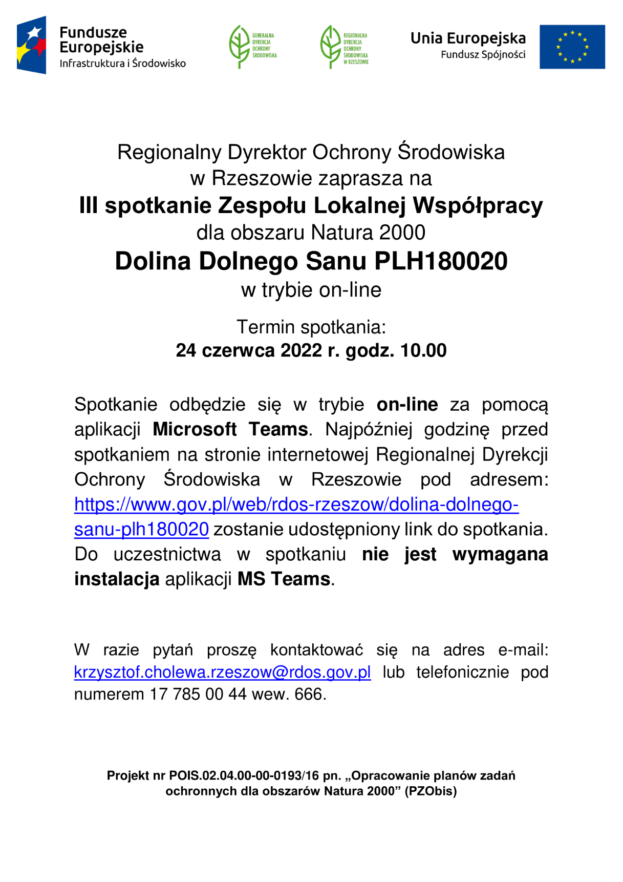 Regionalny Dyrektor Ochrony Środowiska w Rzeszowie zaprasza na III spotkanie Zespołu Lokalnej Współpracy dla obszaru Natura 2000 Dolina Dolnego Sanu PLH180020 w trybie online.