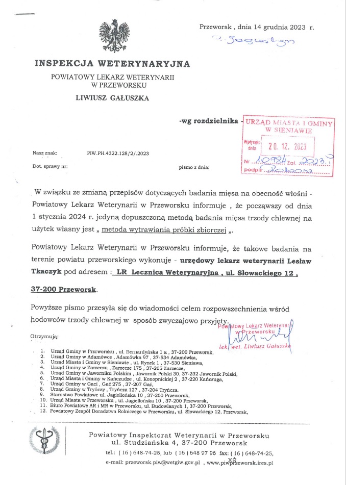 W związku ze zmianą przepisów dotyczących badania mięsa na obecność włośni Powiatowy Lekarz Weterynarii informuje, że począwszy od dnia 1 stycznia 2024 roku, jedyną dopuszczoną metodą badania mięsa trzody chlewnej na użytek własny jest „metoda wytrawiania próbki zbiorczej”. Takowe badania na terenie powiatu przeworskiego wykonuje urzędowy lekarz weterynarii Lesław Tkaczyk LR Lecznica Weterynaryjna, ul. Słowackiego 12, 37-200 Przeworsk.