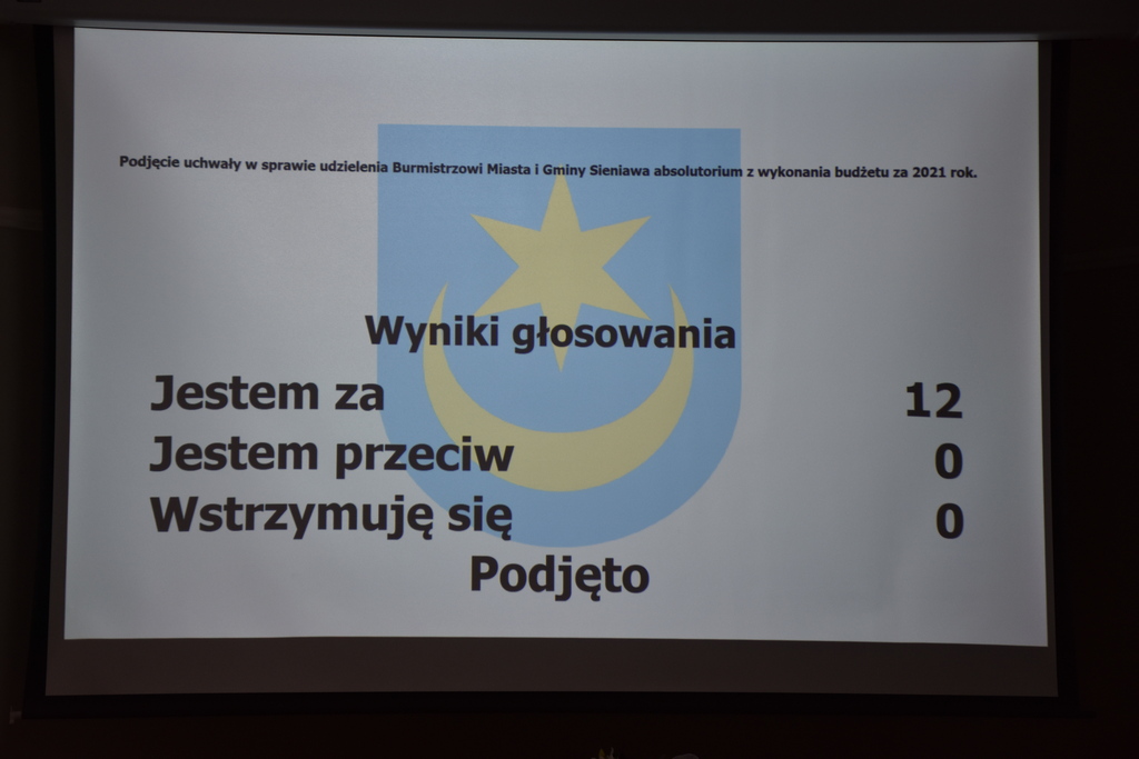 Komisja Rewizyjna Rady Miejskiej w Sieniawie postanowiła pozytywnie ocenić zarówno sprawozdanie z wykonania budżetu za 2021 rok, jak i sprawozdanie finansowe. Podkreśliła również, że przedłożone sprawozdania zostały sporządzone prawidłowo pod względem formalno-rachunkowym i rzetelnie odzwierciedlają stan finansów gminy. Ponadto stwierdziła, że Burmistrz Miasta i Gminy Sieniawa postępował w ramach upoważnień ustawowych, a także przestrzegał dyscypliny finansów publicznych. Mając na uwadze te informacje, 12 obecnych radnych jednogłośnie głosowało za udzieleniem Burmistrzowi Miasta i Gminy Sieniawa absolutorium z wykonania budżetu za 2021 rok. Jest to 16 absolutorium udzielone Adamowi Wosiowi w trakcie sprawowania urzędu Burmistrza Miasta i Gminy Sieniawa. Przewodnicząca Rady Miejskiej Danuta Król złożyła gratulacje burmistrzowi i wręczyła kwiaty.