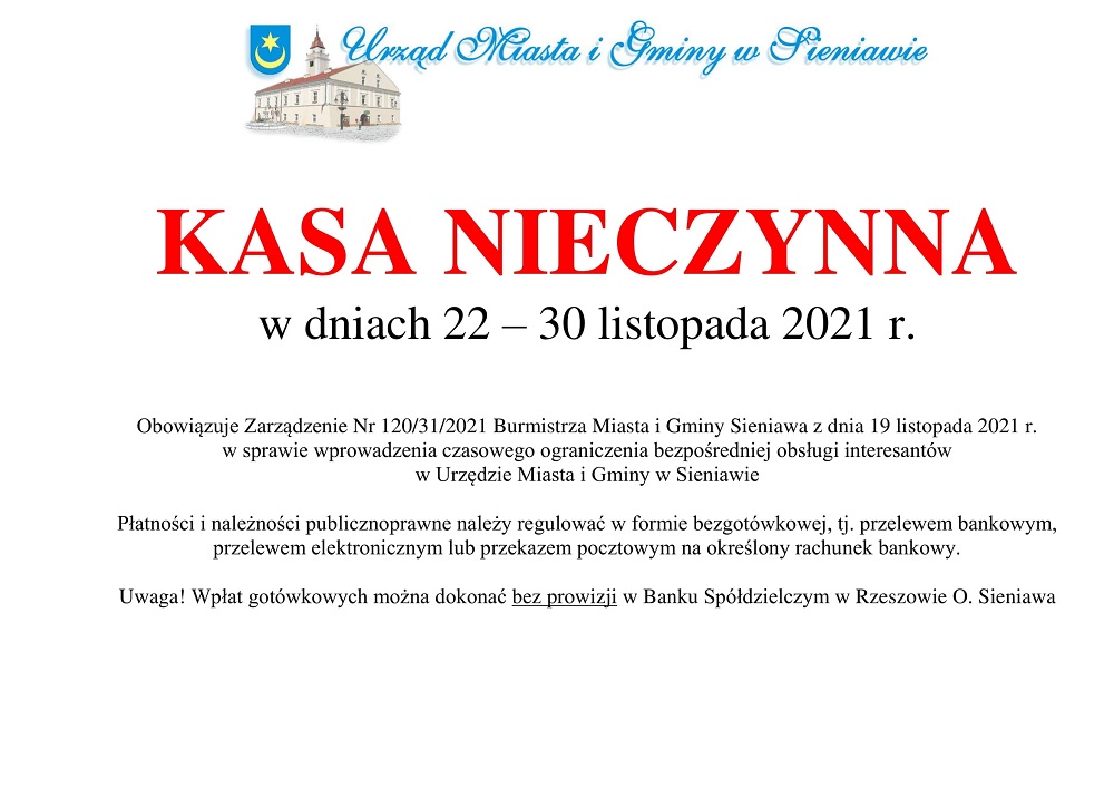 Kasa w Urzędzie Miasta i Gminy w Sieniawie nieczynna w dniach 22 – 30 listopada 2021 r.