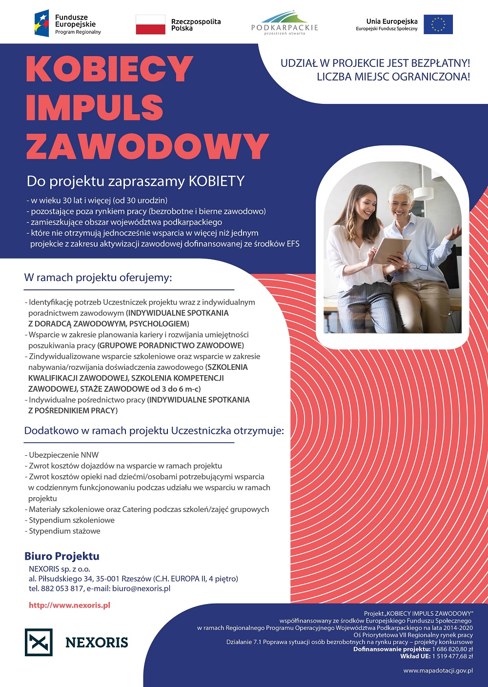 NEXORIS Sp. z o.o. informuje, iż od 01.04.2022 r. realizuje projekt pt. „KOBIECY IMPULS ZAWODOWY” współfinansowany ze środków Europejskiego Funduszu Społecznego w ramach Osi Priorytetowej VII Regionalny rynek pracy Działania 7.1 Poprawa sytuacji osób bezrobotnych na rynku pracy – projekty konkursowe RPO WP 2014-2020 oraz z budżetu państwa.