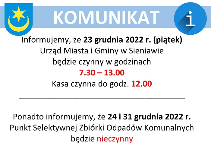23.12  (piatek) - Urząd Miasta i Gminy w Sieniawie czynny do 13.00