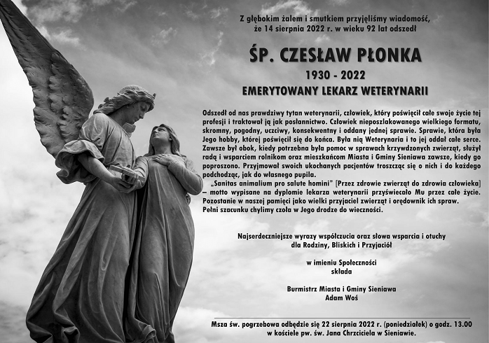Z głębokim żalem i smutkiem przyjęliśmy wiadomość, że 14 sierpnia 2022 r. w wieku 92 lat odszedł śp. Czesław Płonka, emerytowany lekarz weterynarii.