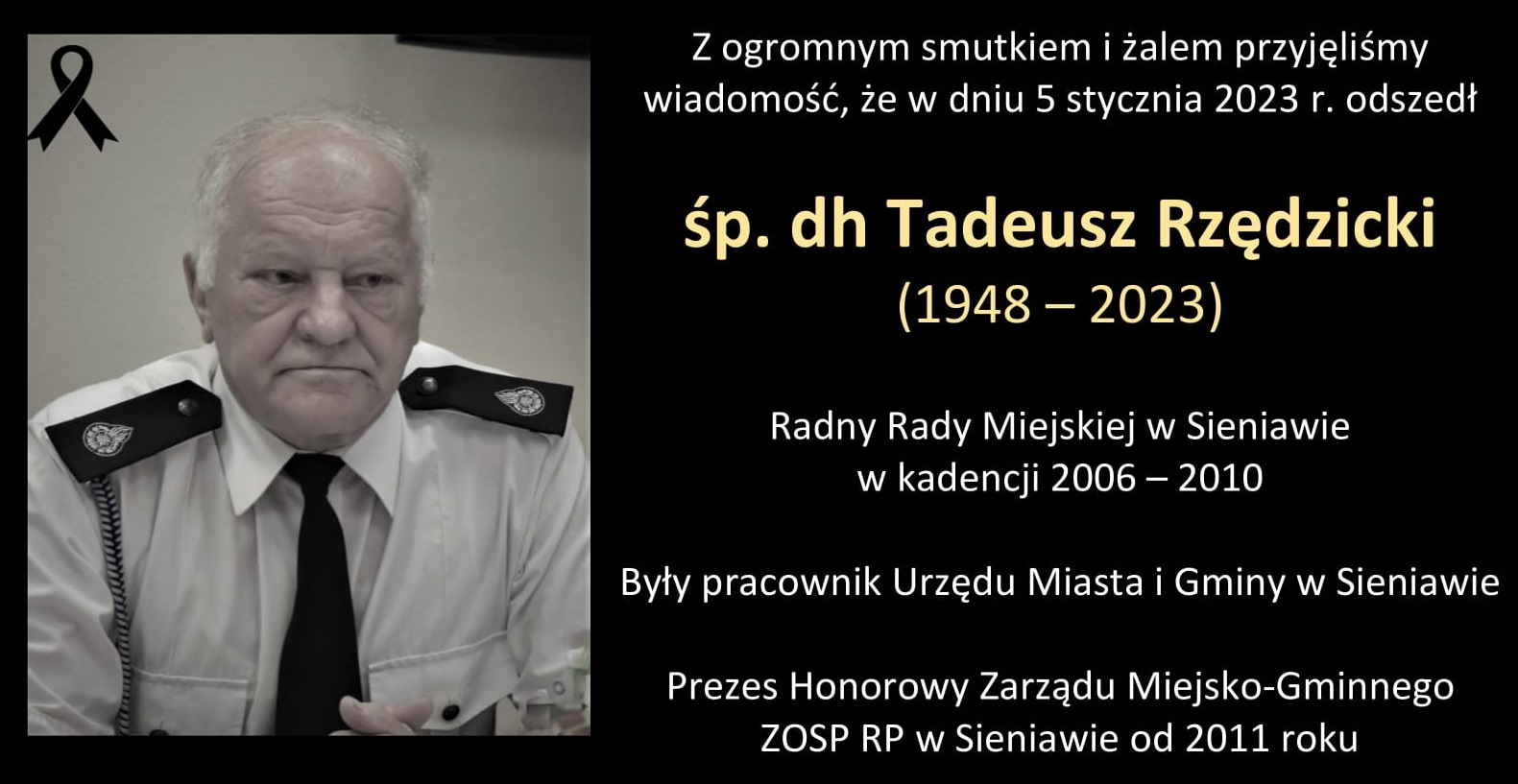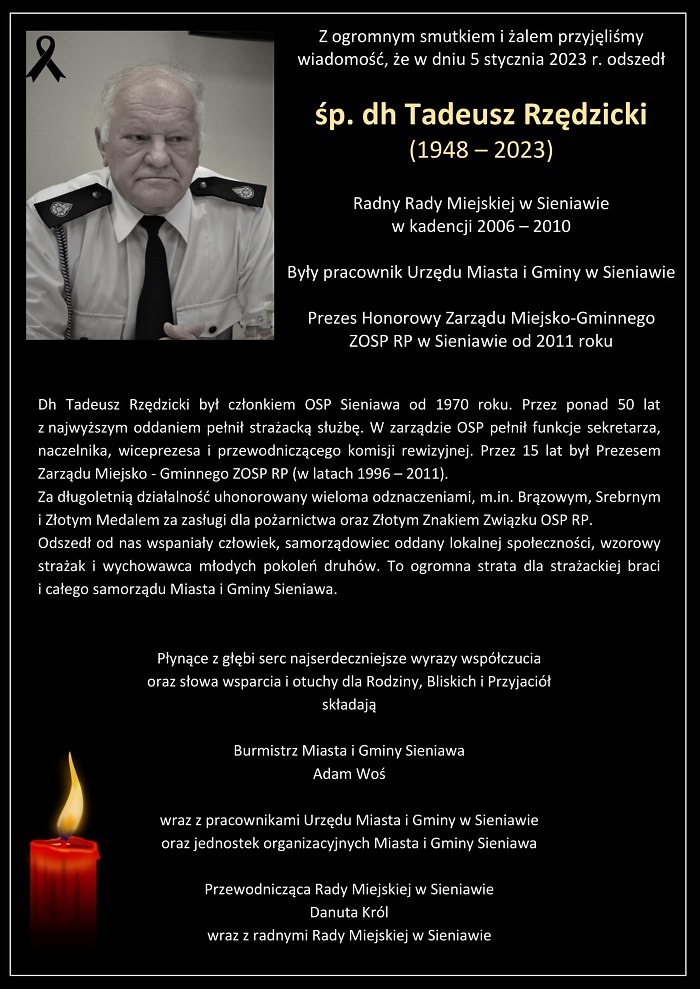 Z ogromnym smutkiem i żalem przyjęliśmy wiadomość, że w dniu 5 stycznia 2023 r. odszedł śp. dh Tadeusz Rzędzicki (1948 – 2023) - Radny Rady Miejskiej w Sieniawie w kadencji 2006 – 2010, były pracownik Urzędu Miasta i Gminy w Sieniawie, Prezes Honorowy Zarządu Miejsko-Gminnego ZOSP RP w Sieniawie od 2011 roku.