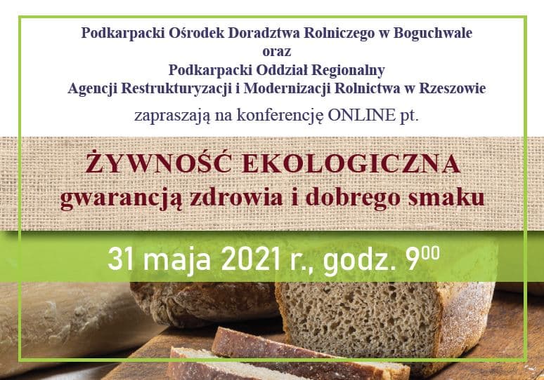 Podkarpacki Ośrodek Doradztwa Rolniczego z siedzibą w Boguchwale wraz z Podkarpackim Oddziałem Regionalnym Agencji Restrukturyzacji i Modernizacji Rolnictwa organizują konferencję pt.: ŻYWNOŚĆ EKOLOGICZNA GWARANCJĄ ZDROWIA I DOBREGO SMAKU. Wydarzenie to odbędzie się 31 maja 2021 r. o godzinie 09.00.