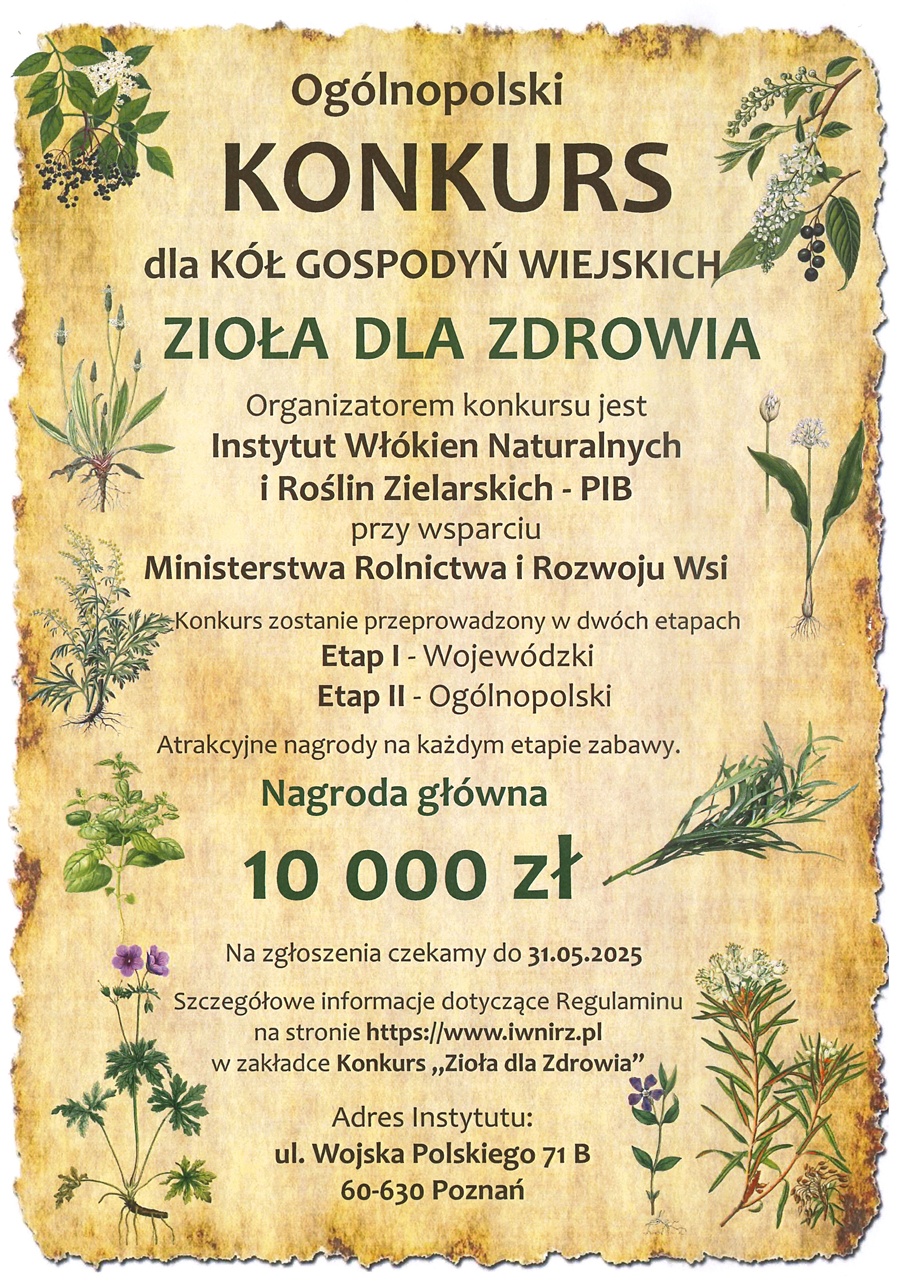 Instytut Włókien Naturalnych i Roślin Zielarskich - PIB w Poznaniu jest organizatorem II Edycji Konkursu "Zioła dla Zdrowia". Konkurs jest skierowany do Kół Gospodyń Wiejskich oraz innych Pozarządowych Organizacji Lokalnych.