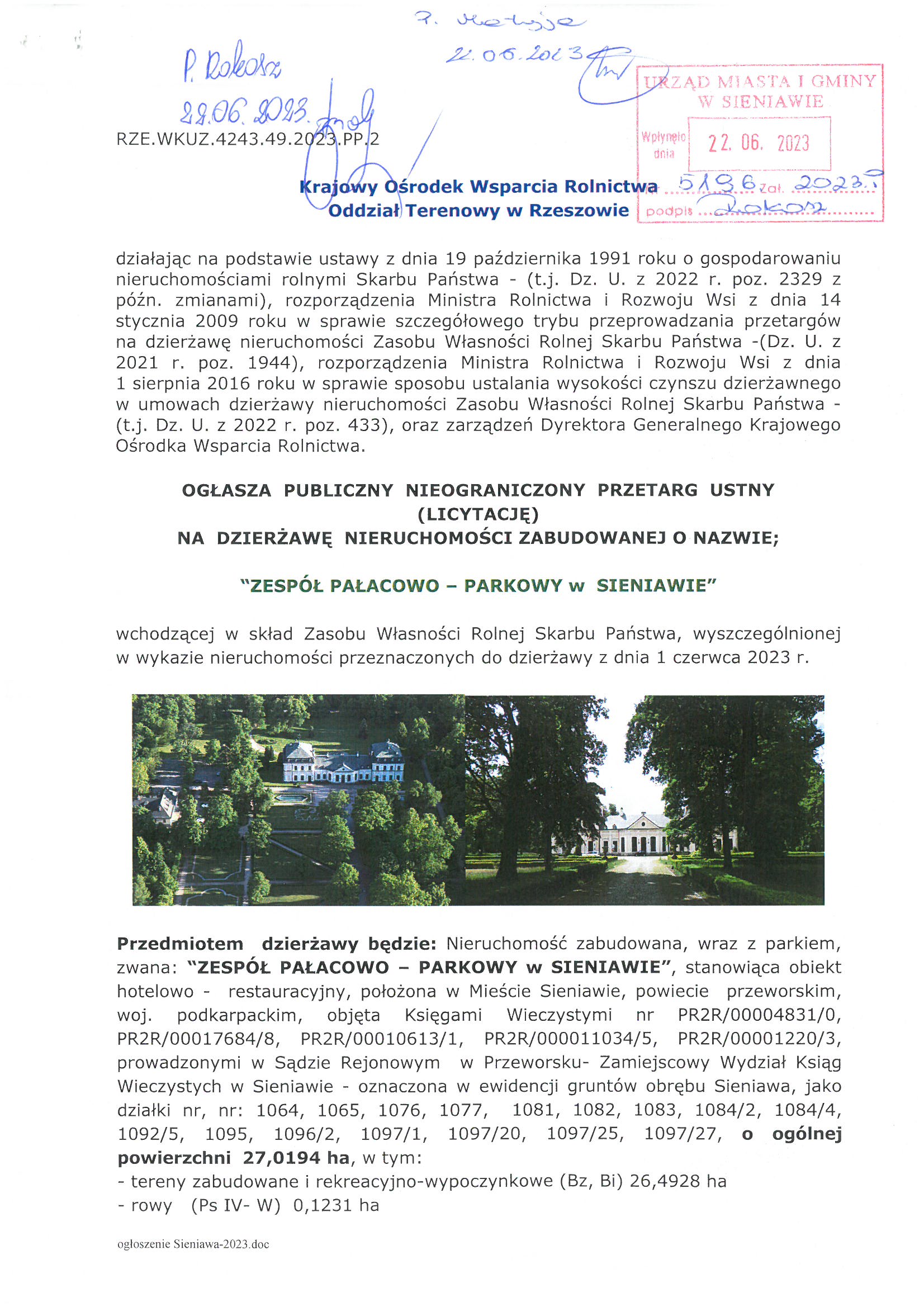 Krajowy Ośrodek Wsparcia Rolnictwa Oddział Terenowy w Rzeszowie ogłasza publiczny nieograniczony przetarg ustny (licytację) na dzierżawę nieruchomości zabudowanej o nazwie „Zespół pałacowo-parkowy w Sieniawie” wchodzącej w skład Zasobu Własności Rolnej Skarbu Państwa, wyszczególnionej w wykazie nieruchomości przeznaczonych do dzierżawy z dnia 1 czerwca 2023 r.