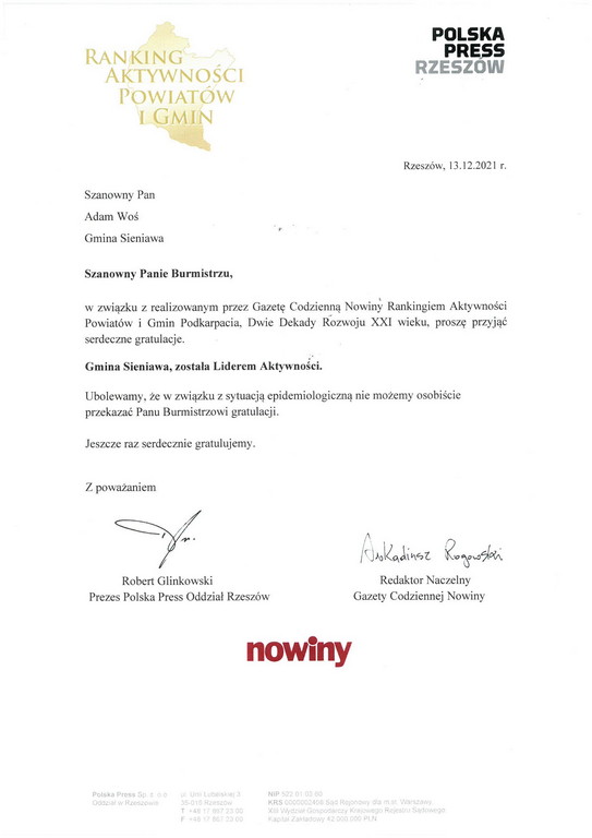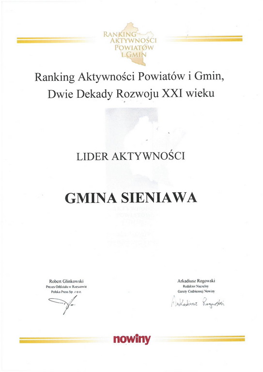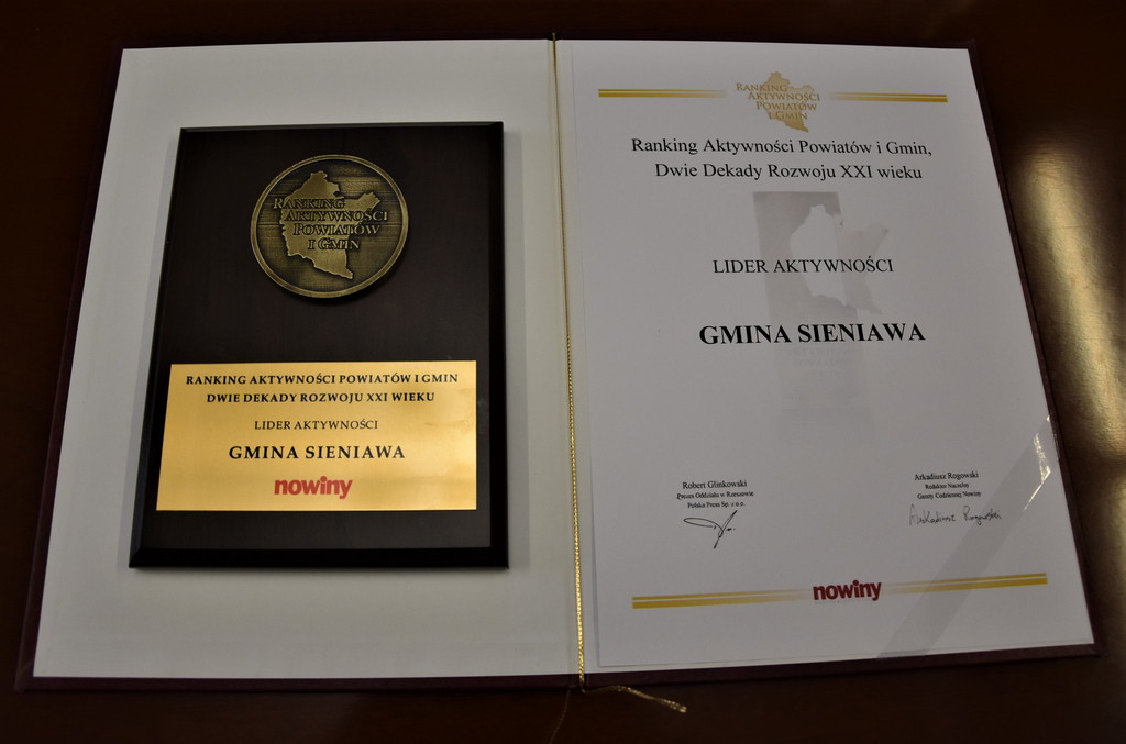 Miasto i Gmina Sieniawa została „Liderem Aktywności” w Rankingu Aktywności Powiatów i Gmin „Dwie Dekady Rozwoju XXI wieku” organizowanym przez Polskie Towarzystwo Ekonomiczne, Małopolski Instytut Gospodarczy w Rzeszowie oraz „Gazetę Codzienną Nowiny”.