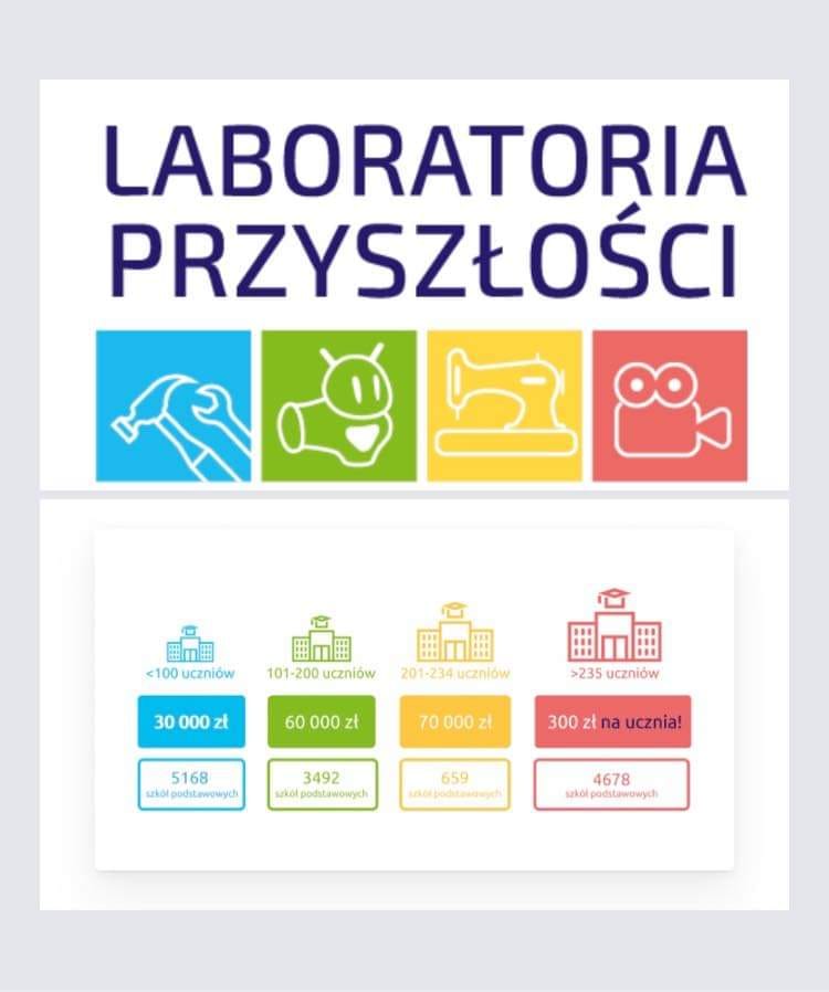 "Laboratoria Przyszłości" to program Ministerstwa Edukacji i Nauki, w ramach którego wszystkie szkoły na terenie naszego kraju mogły się ubiegać o pieniądze na zakup nowoczesnych narzędzi wspierających odkrywanie talentów i rozwijanie kompetencji przyszłości, takich jak współpraca, interdyscyplinarność, kreatywność i rozwiązywanie problemów. O wsparcie mogła starać się każda publiczna, czyli prowadzona przez samorząd szkoła podstawowa. Co istotne, bez wkładu własnego.