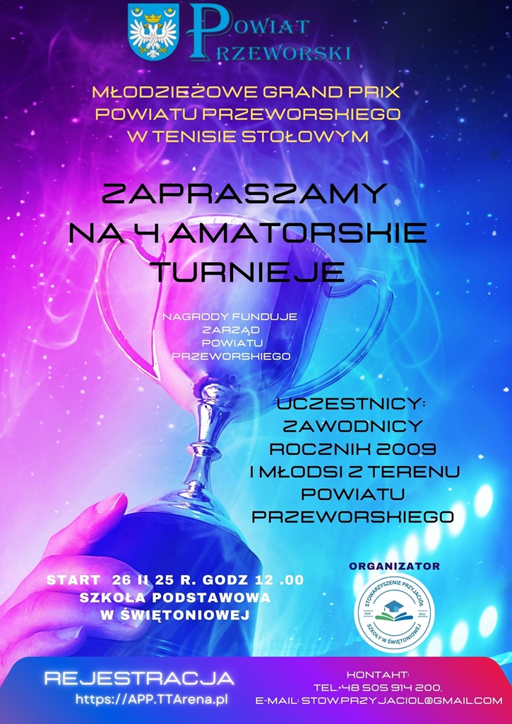 Na projekt składa się organizacja czterech turniejów w tenisie stołowym rozgrywanych w okresie od lutego do maja 2025 roku w sali gimnastycznej Szkoły Podstawowej w Świętoniowej. Turnieje będą skierowane do dzieci i młodzieży, rocznik 2009 i młodsi, będących zarówno członkami klubów sportowych jak i amatorsko uprawiających tę dyscyplinę sportu. Osoby chcące brać udział w wymienionych turniejach rejestrują się poprzez stronę https://app.ttarena.pl . Do każdego turnieju kwalifikuje się pierwszych 16 zawodników i zawodniczek. Wszelkie wątpliwości wyjaśniane będą telefonicznie pod numerem telefonu; +48 505 914 200 oraz e-mailem; stow.przyjaciol@gmail.com. Informacje o terminach umieszczane będą na facebooku „ Tenis stołowy Świętoniowa”. Pierwszy turniej planujemy rozegrać w okresie ferii szkolnych w dniu 26.02.2025 roku o godz. 12.00.