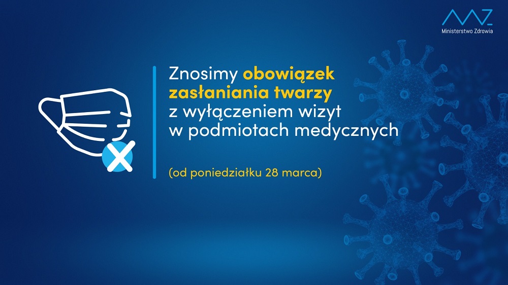 Od 28 marca 2022 r. zniesiony został obowiązek noszenia maseczek w pomieszczeniach zamkniętych, z wyjątkiem budynków, w których prowadzona jest działalność lecznicza oraz aptek.
