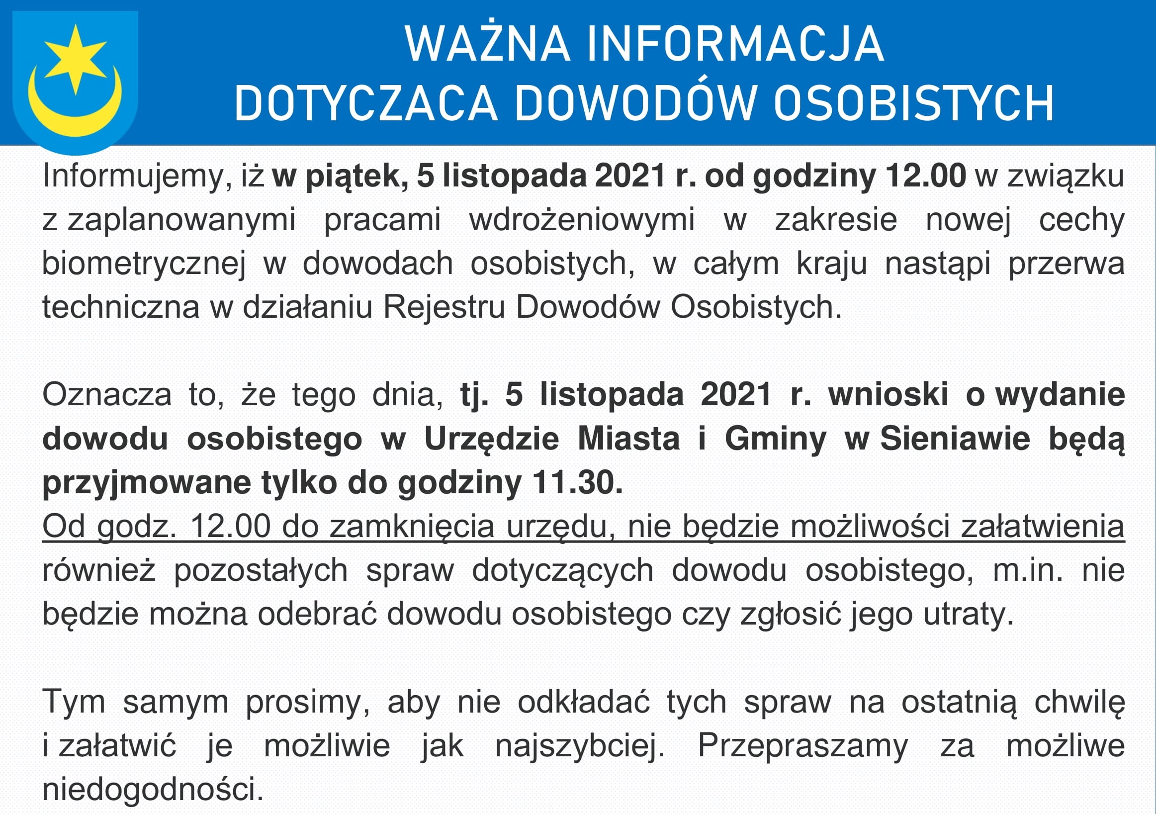 Oznacza to, że tego dnia, tj. 5 listopada 2021 r. wnioski o wydanie dowodu osobistego w Urzędzie Miasta i Gminy w Sieniawie będą przyjmowane tylko do godziny 11.30.