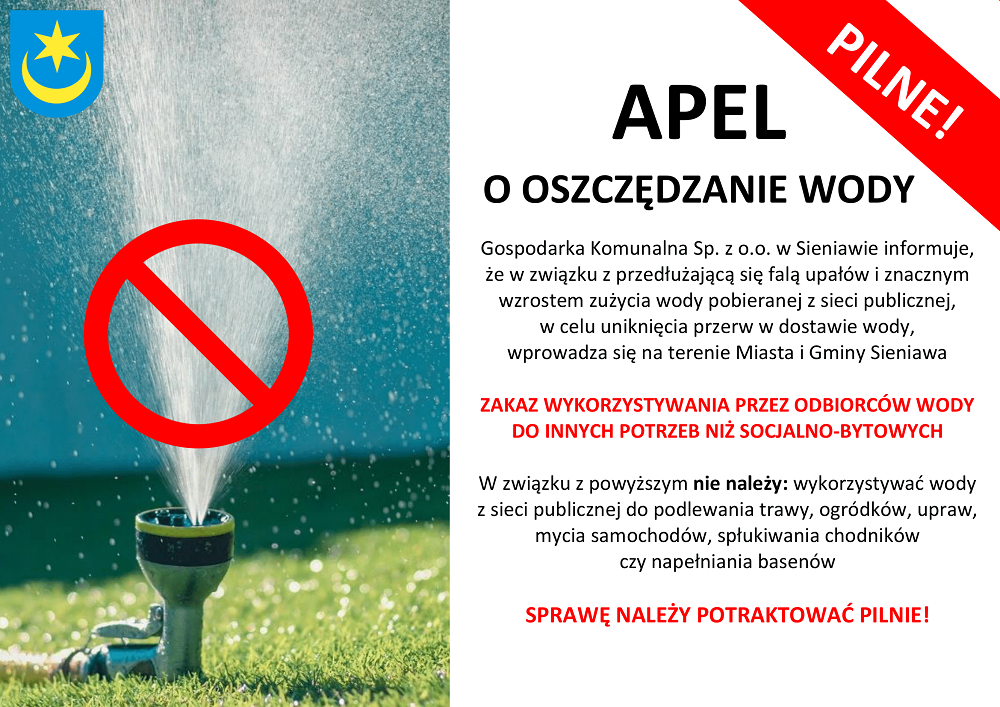 Gospodarka Komunalna Sp. z o.o. w Sieniawie informuje, że w związku z przedłużającą się falą upałów i znacznym wzrostem zużycia wody pobierającej z sieci publicznej, w celu uniknięcia przerw w dostawie wody, wprowadza się na terenie Miasta i Gminy Sieniawa zakaz wykorzystywania przez odbiorców wody do innych potrzeb niż socjalno-bytowych.