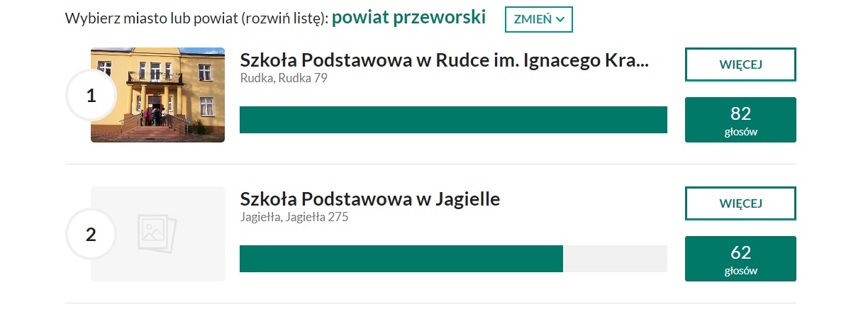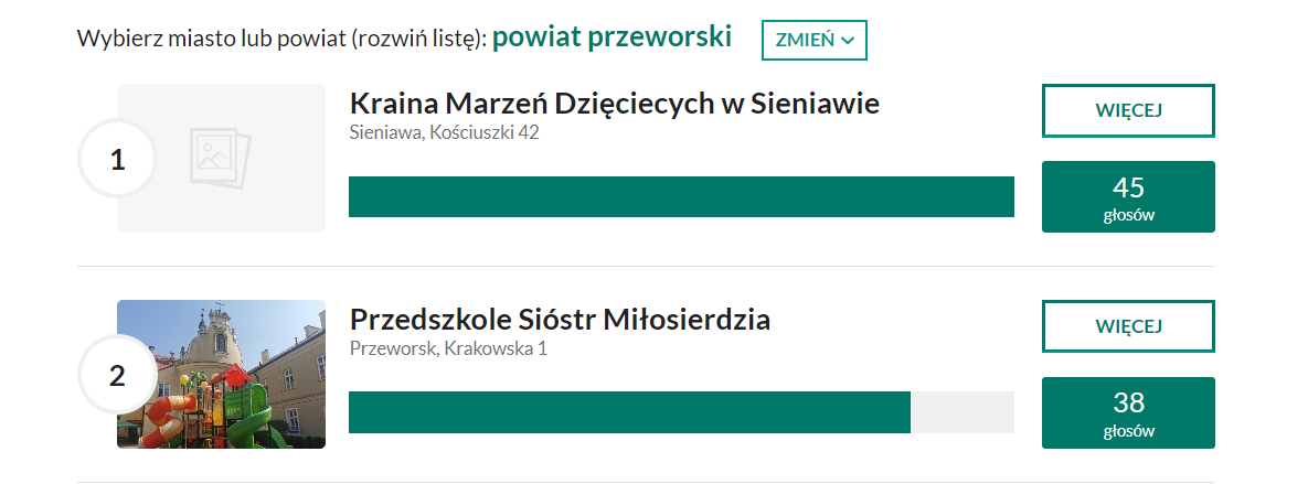 Szkoły i przedszkola, które w każdym mieście i powiecie zdobyły najwięcej głosów, otrzymują: