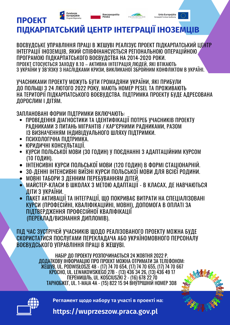 Воєвудське Управління Праці в Жешуві реалізує проект Підкарпатський Центр Інтеграції Іноземців, який співфінансується Регіональною Операційною Програмою Підкарпатського Воєвудства на 2014-2020 роки. Проект стосується Заходу 8.10 – Активна інтеграція людей, які втікають з України у зв'язку з наслідками кризи, викликаної збройним конфліктом в Україні.
