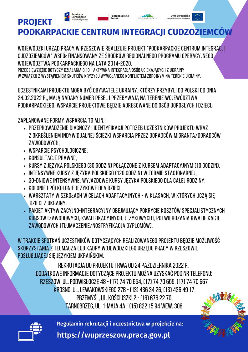 Wojewódzki Urząd Pracy w Rzeszowie realizuje projekt Podkarpackie Centrum Integracji Cudzoziemców współfinansowany ze środków Regionalnego Programu Operacyjnego Województwa Podkarpackiego na lata 2014-2020. Przedsięwzięcie dotyczy Działania 8.10 – Aktywna integracja osób uciekających z Ukrainy w związku z wystąpieniem skutków kryzysu wywołanego konfliktem zbrojnym na terenie Ukrainy.