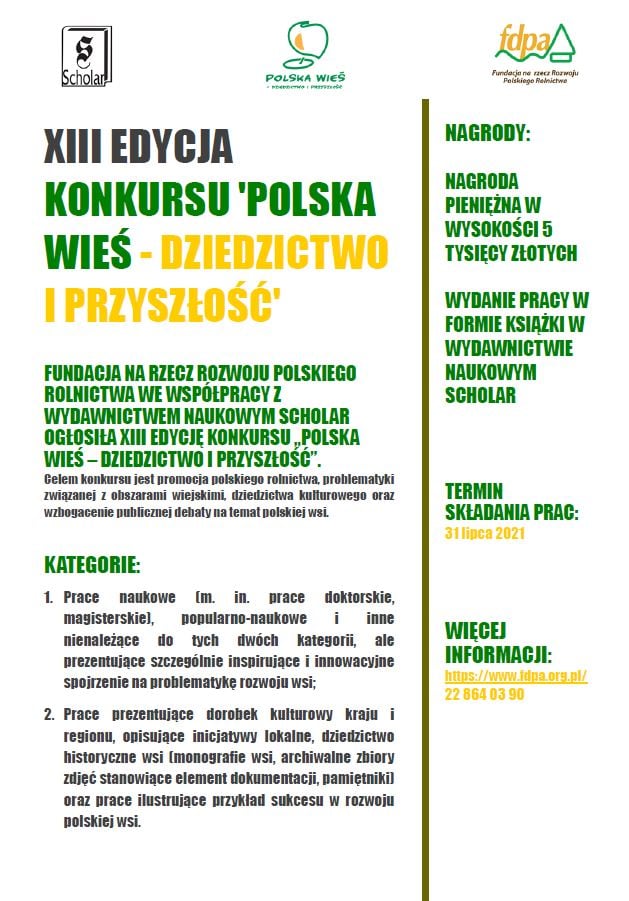 Fundacja na rzecz Rozwoju Polskiego Rolnictwa ogłosiła XIII edycję konkursu „Polska wieś – dziedzictwo i przyszłość". Celem konkursu jest promocja polskiego rolnictwa, problematyki związanej z obszarami wiejskimi, dziedzictwa kulturowego oraz wzbogacenie publicznej debaty na temat polskiej wsi.