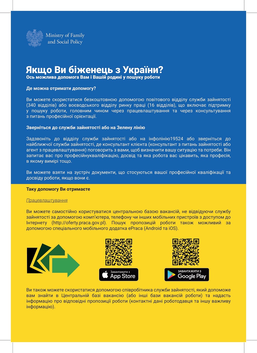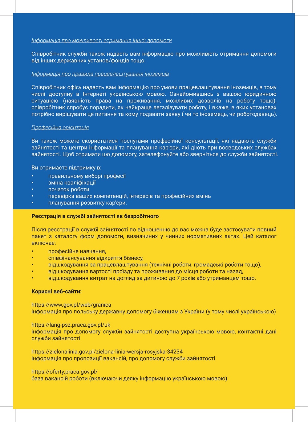 https://lang-psz.praca.gov.pl/uk – dostępne w języku ukraińskim informacje o pomocy urzędów pracy, dane kontaktowe urzędów pracy