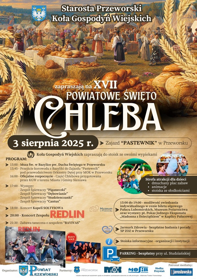 Starosta Przeworski oraz Koła Gospodyń WIejskich zapraszają na XVII Powiatowe Święto Chleba - 3 sierpnia 2025 r., Zajazd Pastewnik w Przeworsku