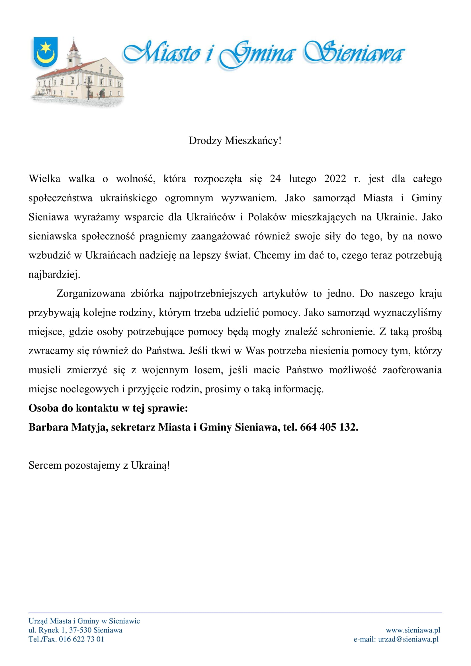 Wielka walka o wolność, która rozpoczęła się 24 lutego 2022 r. jest dla całego społeczeństwa ukraińskiego ogromnym wyzwaniem. Jako samorząd Miasta i Gminy Sieniawa wyrażamy wsparcie dla Ukraińców i Polaków mieszkających na Ukrainie. Jako sieniawska społeczność pragniemy zaangażować również swoje siły do tego, by na nowo wzbudzić w Ukraińcach nadzieję na lepszy świat. Chcemy im dać to, czego teraz potrzebują najbardziej.