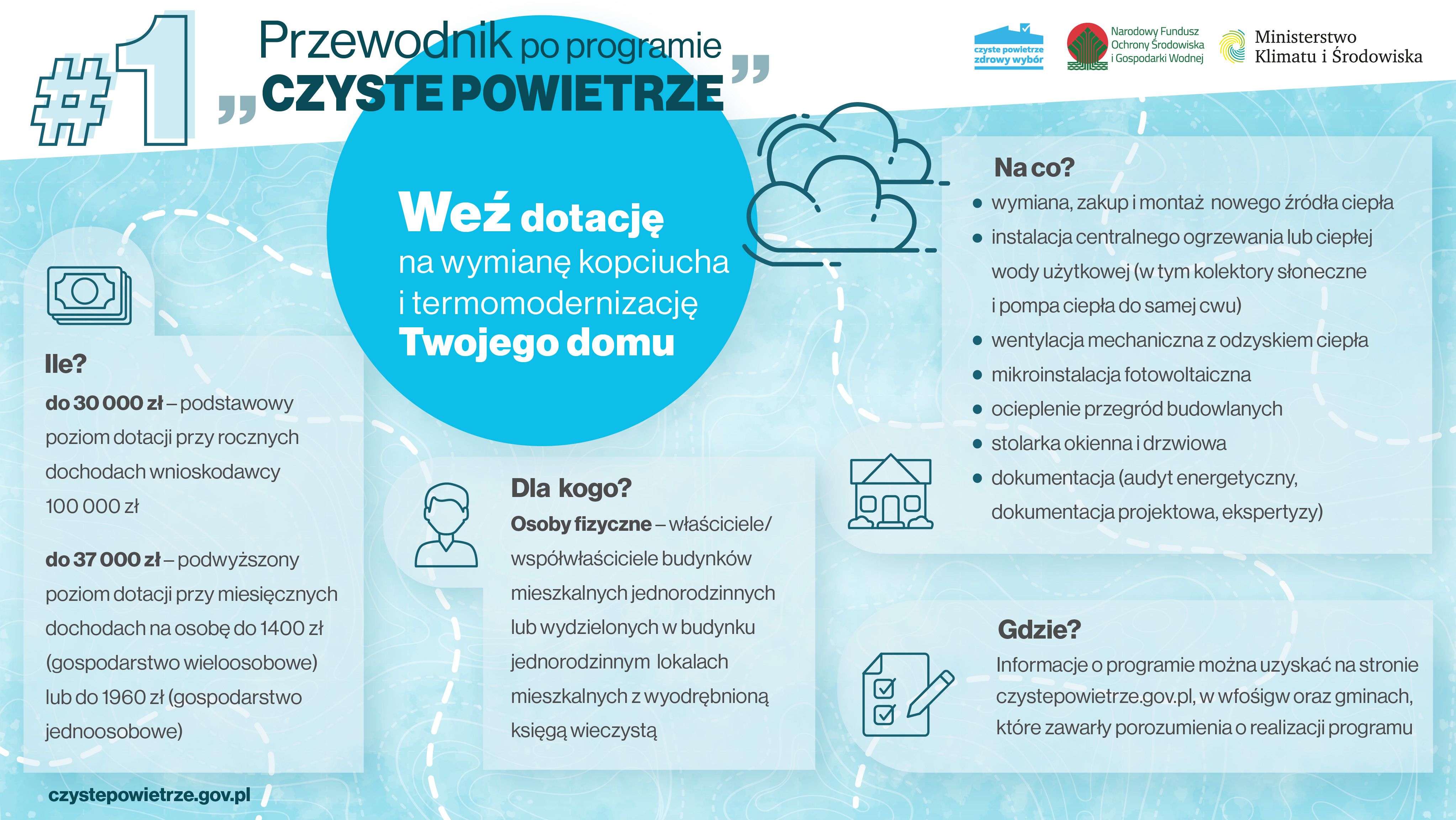 Weź dotację na wymianę kopciucha i termomodernizację domu. Zachęcamy do zapoznania się z przewodnikiem po programie CZYSTE POWIETRZE.