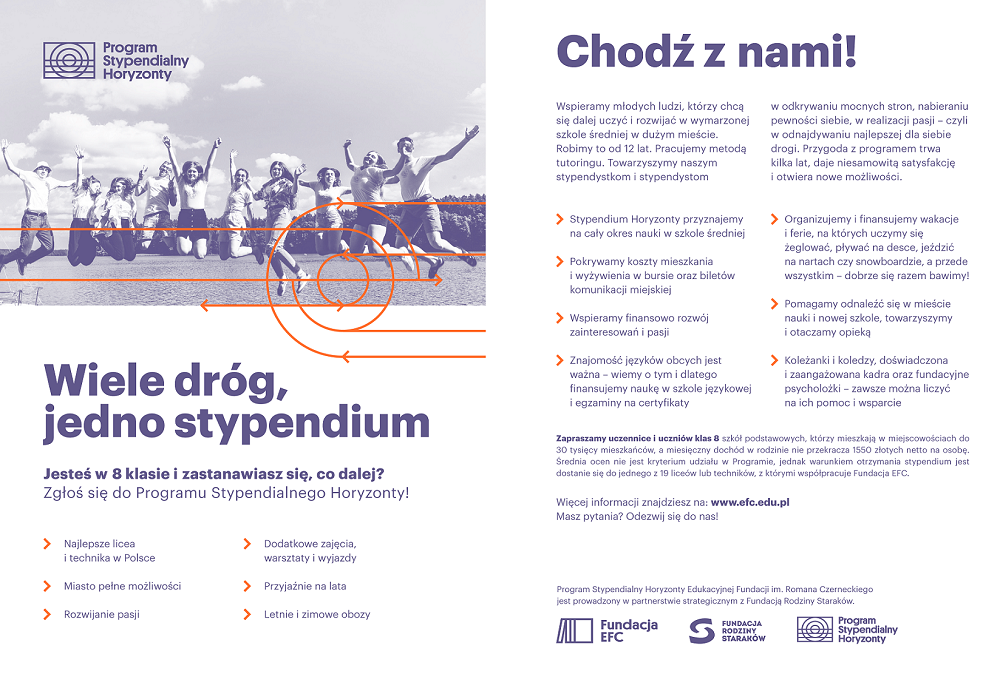Ósmoklasisto, właśnie się rozpoczęła rekrutacja do Programu Stypendialnego Horyzonty Fundacji EFC! Stypendystów czekają wspólne wakacje i ferie, warsztaty, dodatkowe zajęcia i wsparcie profesjonalnej kadry.