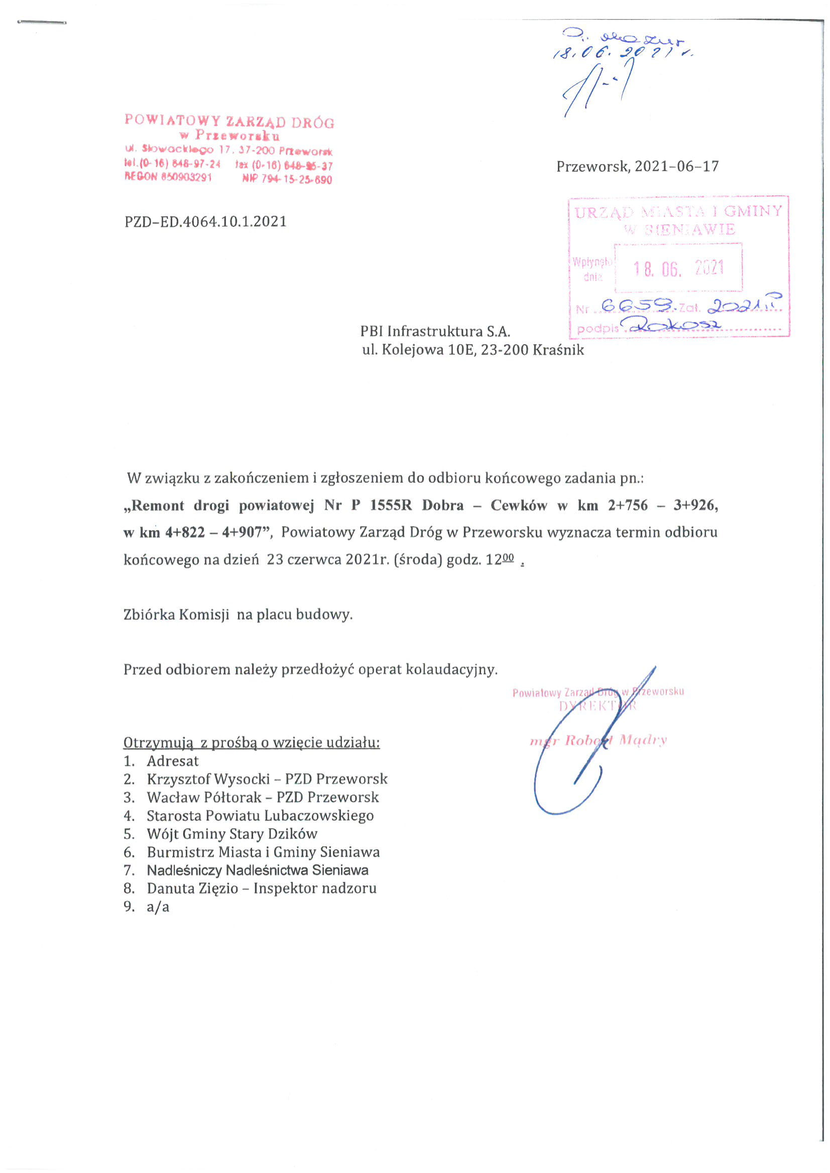 Takie zawiadomienie wpłynęło do Urzędu Miasta i Gminy w Sieniawie. Nie czekając na odbiór techniczny, już dwa dni wcześniej, 21 czerwca władze Powiatu Przeworskiego zorganizowały uroczystość oficjalnego oddania do użytku ostatniego przebudowanego odcinka (jednakże tylko dla wybranych gości) o czym Powiat zakomunikował na Facebooku i swojej stronie internetowej. Oprócz osobistości związanych z Powiatem Przeworskim czy przedstawicieli Wykonawcy, z zewnątrz pojawili się starosta Powiatu Lubaczowskiego Zenon Swatek, wójt Gminy Stary Dzików Tomasz Jabłoński, których samorządy partycypowały w kosztach przebudowy drogi. To miłe. Dla Burmistrza Miasta i Gminy Sieniawa bądź kogokolwiek z ramienia sieniawskiego samorządu zaproszenia zabrakło. Zabrakło kawałka papieru, zabrakło nożyczek, zabrakło przede wszystkim chęci tej obecności. ZAPOMNIANO, że w każdym z trzech etapów modernizacji samorząd Miasta i Gminy Sieniawa udzielił Powiatowi łącznej pomocy finansowej na kwotę ponad 320 tys. zł, w sumie najwięcej spośród pozostałych. To nasze wspólne pieniądze, wszystkich mieszkańców. Dobra praktyka czy wręcz kultura wymagała zaprosić bez względu na wszystko. Tej ostatniej jednak zabrakło. Jak widać, nie jesteśmy godni powiatowych nożyczek.