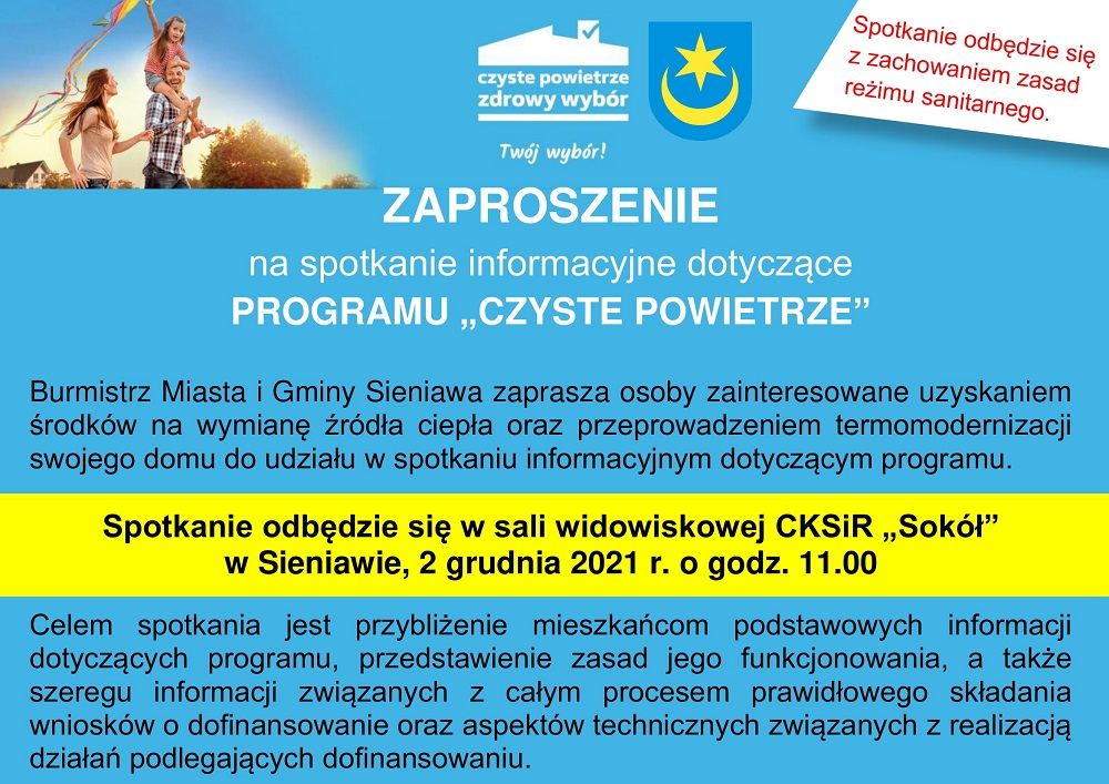 Burmistrz Miasta i Gminy Sieniawa zaprasza osoby zainteresowane uzyskaniem środków na wymianę źródła ciepła oraz przeprowadzeniem termomodernizacji swojego domu do udziału w spotkaniu informacyjnym dotyczącym programu. UWAGA! Spotkanie z sali konferencyjnej UMiG zostaje przeniesione do sali widowiskowej CKSiR "Sokół".