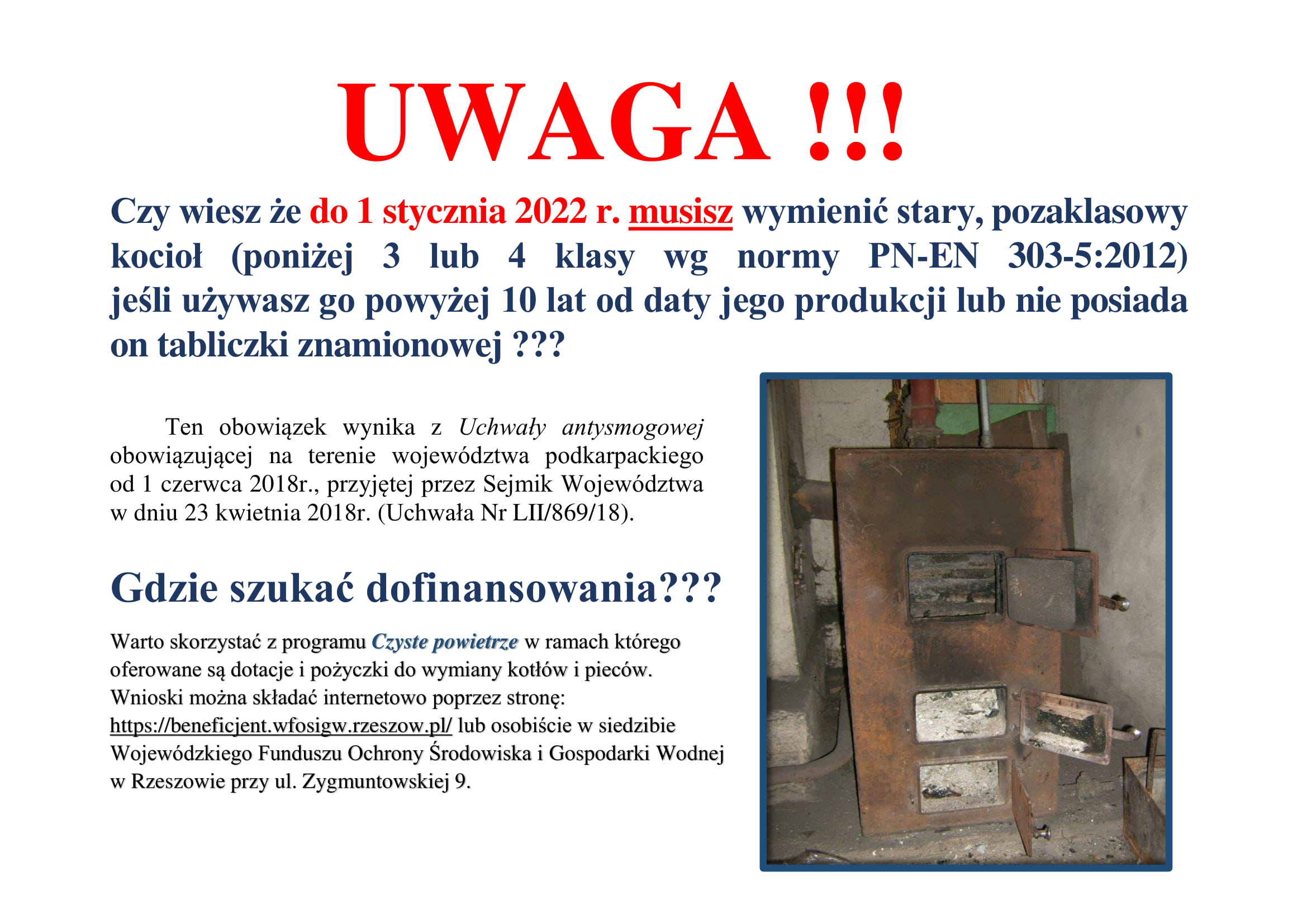 Od 23 kwietnia 2018 r. na terenie Województwa Podkarpackiego obowiązuje tzw. uchwała antysmogowa – Uchwała Nr LII/869/18 Sejmiku Województwa Podkarpackiego z dnia 23 kwietnia 2018 r. w sprawie wprowadzenia na obszarze województwa podkarpackiego ograniczeń w zakresie instalacji, w których następuje spalanie paliw.