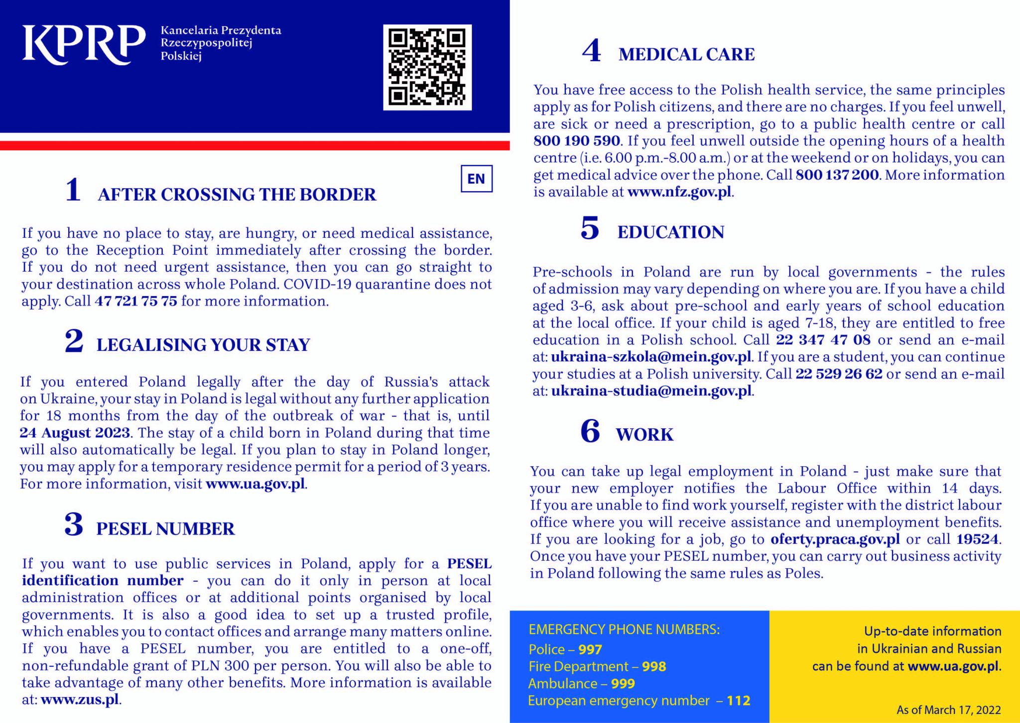 Kancelaria Prezydenta Rzeczypospolitej Polskiej przygotowała nową, zaktualizowaną ulotkę informacyjną dla uchodźców z Ukrainy. Po aktualizacji uwzględnia najnowsze zmiany prawne, które nastąpiły po wejściu w życie ustawy o pomocy obywatelom Ukrainy w związku z konfliktem zbrojnym na terytorium tego państwa.