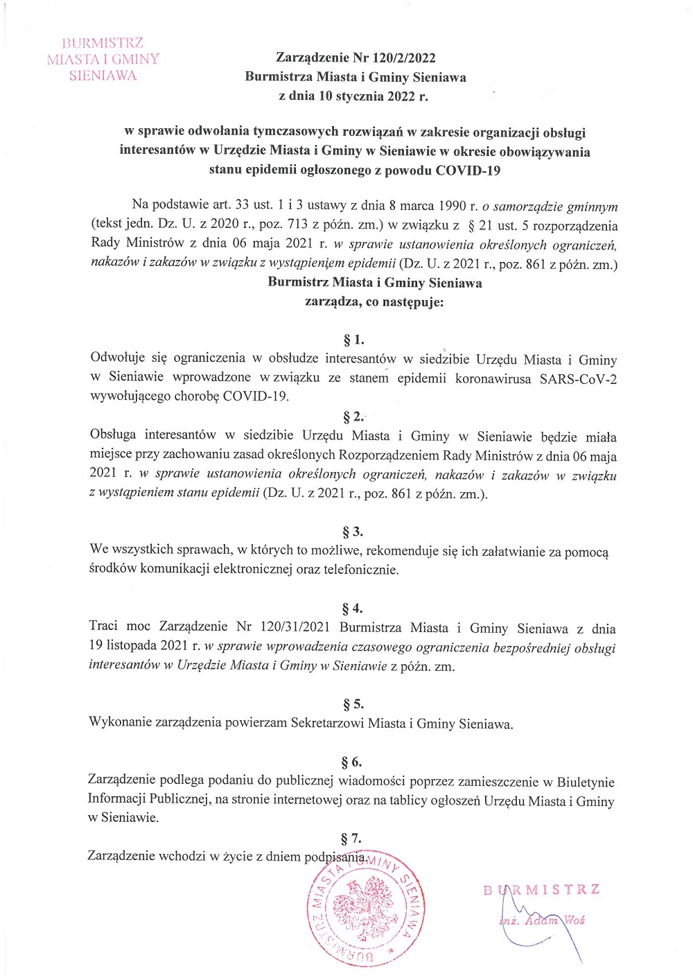 Traci moc Zarządzenie Nr 120/31/2021 Burmistrza Miasta i Gminy Sieniawa z dnia 19 listopada 2021 r. w sprawie wprowadzenia czasowego ograniczenia bezpośredniej obsługi interesantów w Urzędzie Miasta i Gminy w Sieniawie z późn. zm.