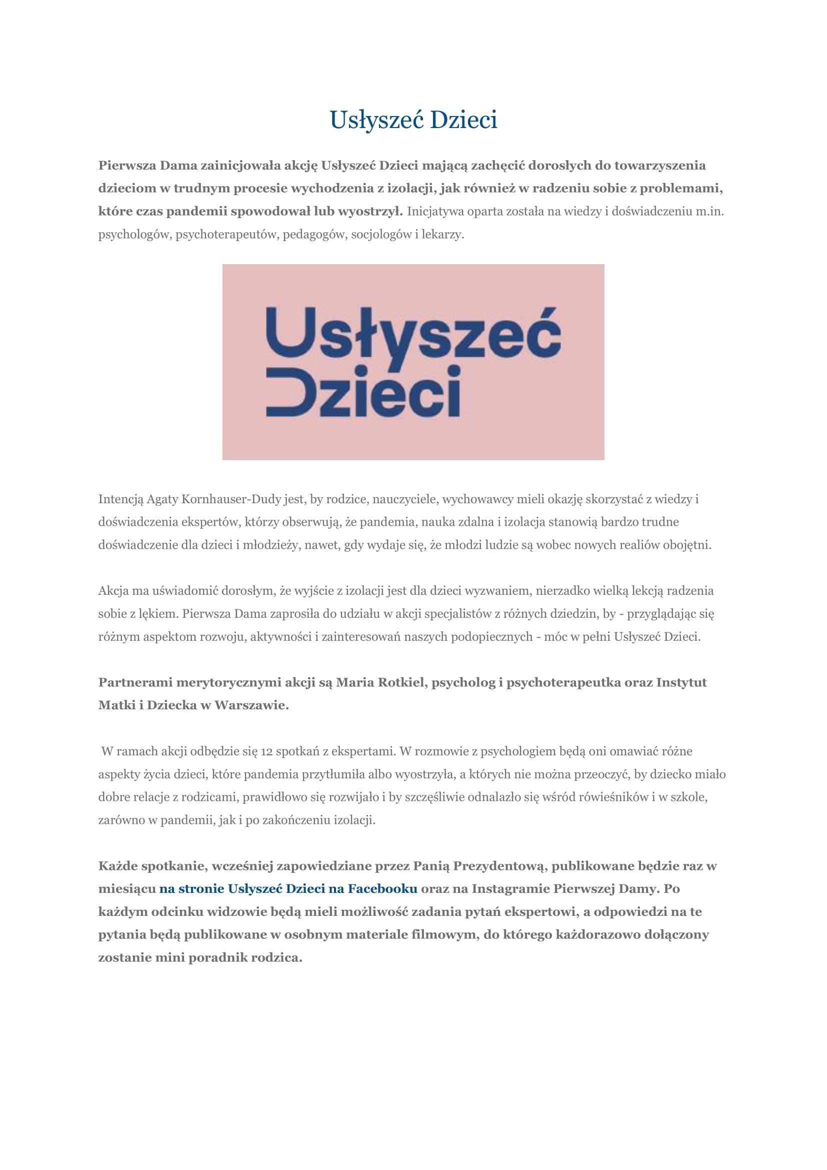 Agata Kornhauser-Duda zainicjowała akcję Usłyszeć Dzieci mającą zachęcić dorosłych do towarzyszenia dzieciom w trudnym procesie wychodzenia z izolacji, jak również w radzeniu sobie z problemami, które czas pandemii spowodował lub wyostrzył.