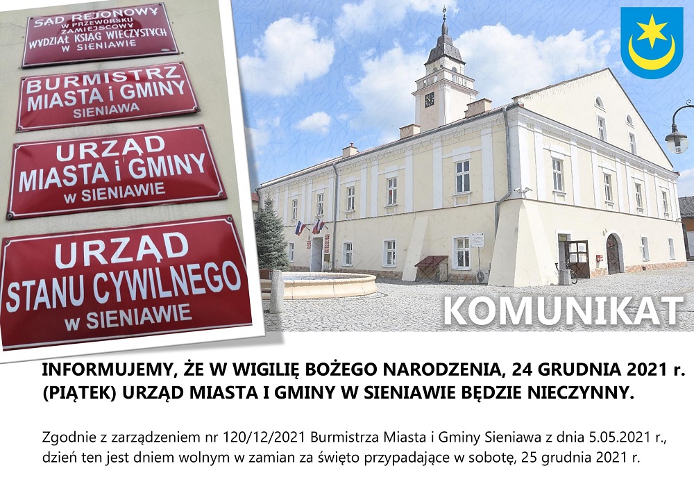 INFORMUJEMY, ŻE W WIGILIĘ BOŻEGO NARODZENIA, 24 GRUDNIA 2021 r. (PIĄTEK) URZĄD MIASTA I GMINY W SIENIAWIE BĘDZIE NIECZYNNY.