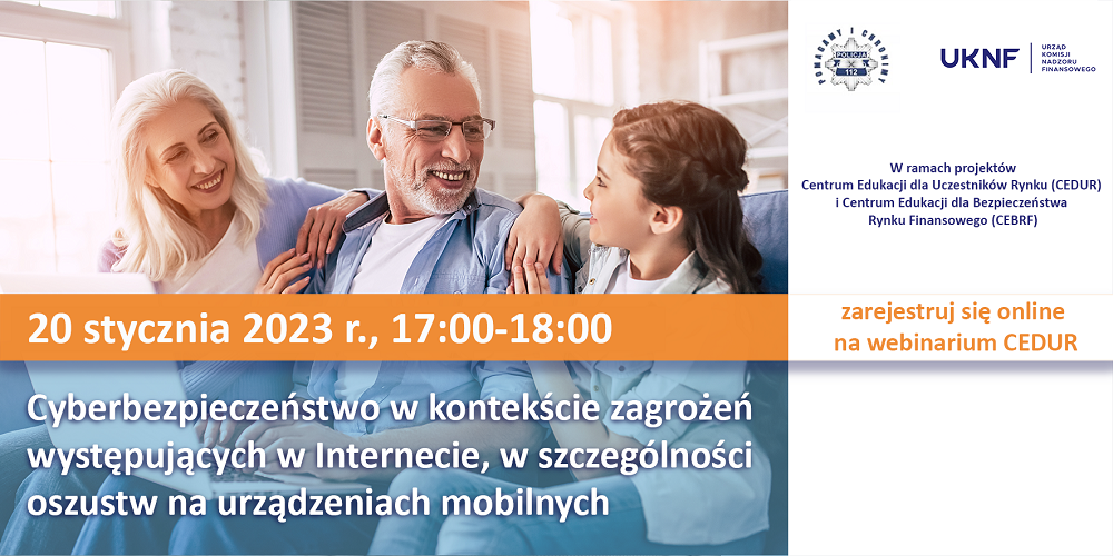Urząd Komisji Nadzoru Finansowego zaprasza na webinarium CEDUR dla seniorów pt. „Cyberbezpieczeństwo w kontekście zagrożeń występujących w Internecie, w szczególności oszustw na urządzeniach mobilnych” w dniu 20 stycznia 2023 r.