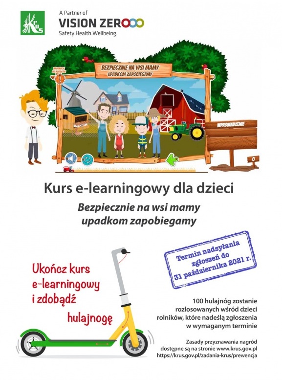 Kasa Rolniczego Ubezpieczenia Społecznego zaprasza dzieci rolników urodzone w latach 2007-2015 do udziału w kursie e-learningowym pt. „Bezpiecznie na wsi mamy – upadkom zapobiegamy”, który w nowoczesnej formie przybliża zagrożenia wypadkowe w gospodarstwach rolnych, a także uczy prawidłowych zachowań podczas przebywania na terenie obejścia. Wśród tych, którzy go ukończą i prześlą swoje zgłoszenia, rozlosujemy 100 hulajnóg.
