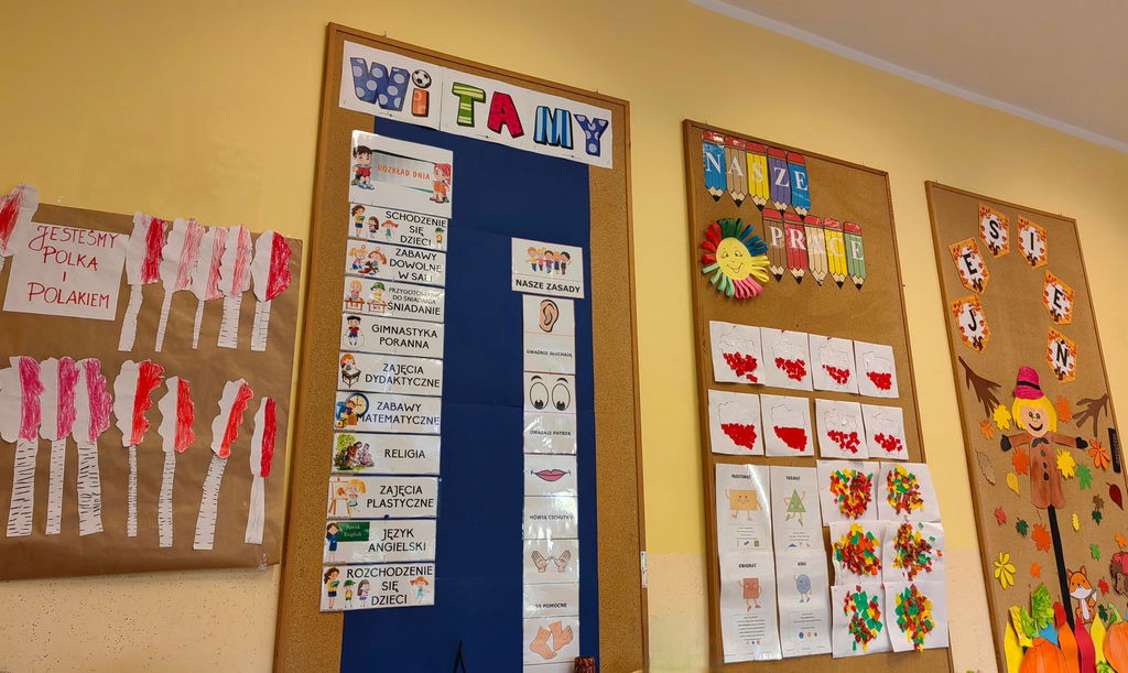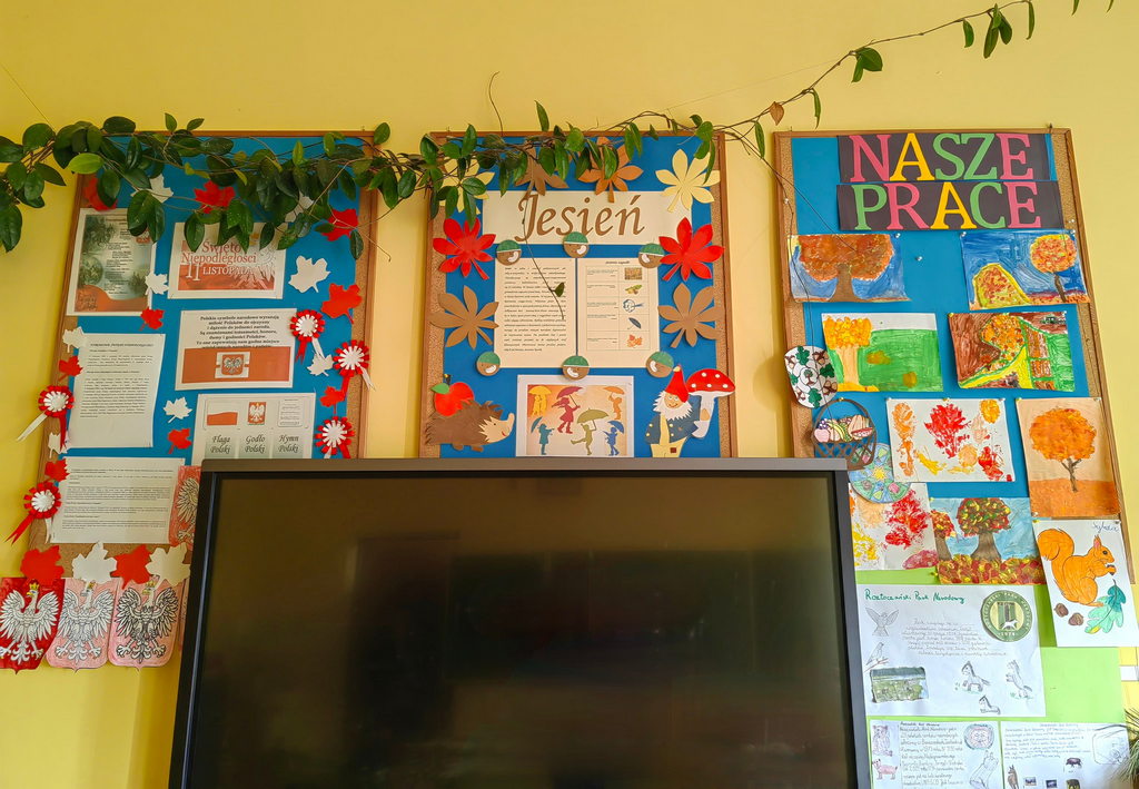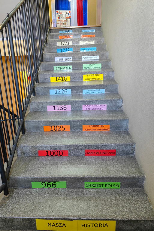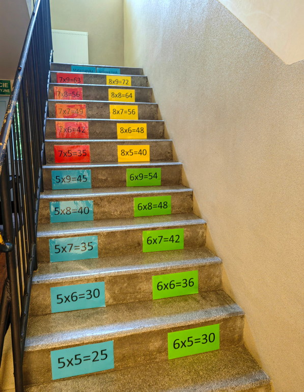 Uczniowie w Szkole Podstawowej w Wylewie uczą się nawet na schodach. Tabliczka mnożenia, ważne daty historyczne czy angielskie czasowniki nieregularne na pewno zostaną lepiej zapamiętane, jeżeli będą codziennie w zasięgu wzroku uczniów. Ściany w klasach zdobią tematyczne gazetki, prace uczniów i materiały pomocne w nauce. Kolorowa szkoła jest przyjazna, a nauka w takim otoczeniu z pewnością przychodzi łatwiej.