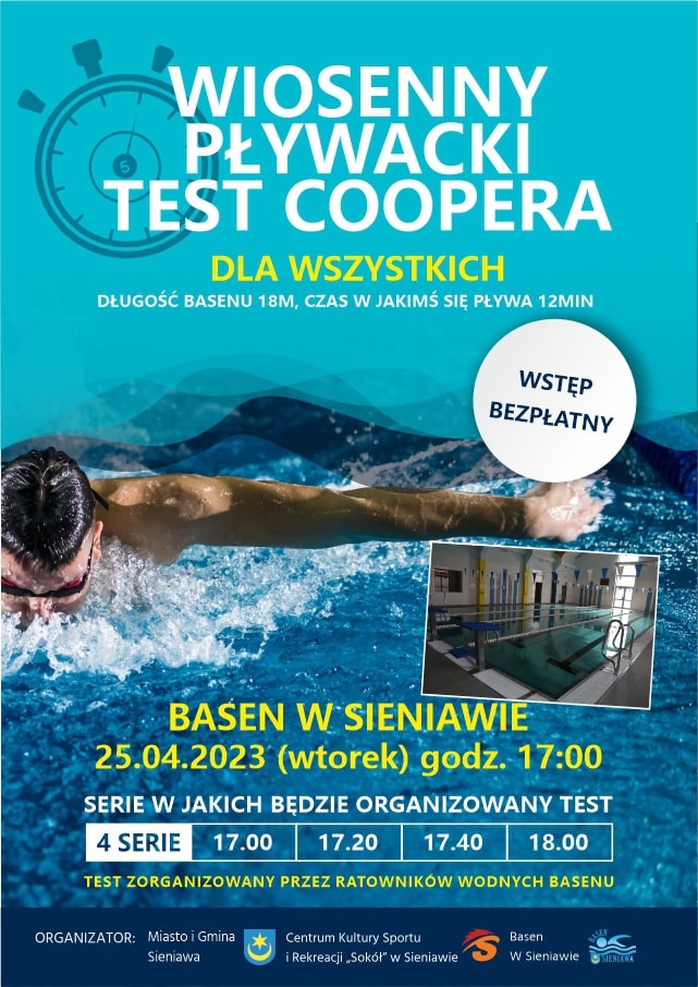 Burmistrz Miasta i Gminy Sieniawa, Centrum Kultury, Sportu i Rekreacji "Sokół" i Basen w Sieniawie zapraszają dzieci, młodzież jak i również dorosłych na Wiosenny Pływacki Test Coopera pod hasłem "Świetnie pływamy, nałogom się nie damy", który ma na celu poprawę naszego zdrowia fizycznego związanego z profilaktyką zdrowego stylu życia, wolnego od nałogów i uzależnień. Test odbędzie się 25.04.23 r. o godzinie 17:00.