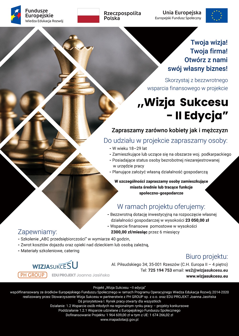 Projekt pn. „Wizja Sukcesu - II edycja" współfinansowany ze środków Europejskiego Funduszu Społecznego jest realizowany przez Stowarzyszenie Wizja Sukcesu w partnerstwie z EDU PROJEKT Joanna Jasińska i PH Group sp. z o.o. w ramach programu Operacyjnego Wiedza Edukacja Rozwój 2014-2020, oś priorytetowa I. Rynek pracy otwarty dla wszystkich. Działanie: 1.2 Wsparcie osób młodych na regionalnym rynku pracy projekty konkursowe. Poddziałanie: 1.2.1 Wsparcie udzielane z Europejskiego Funduszu Społecznego.