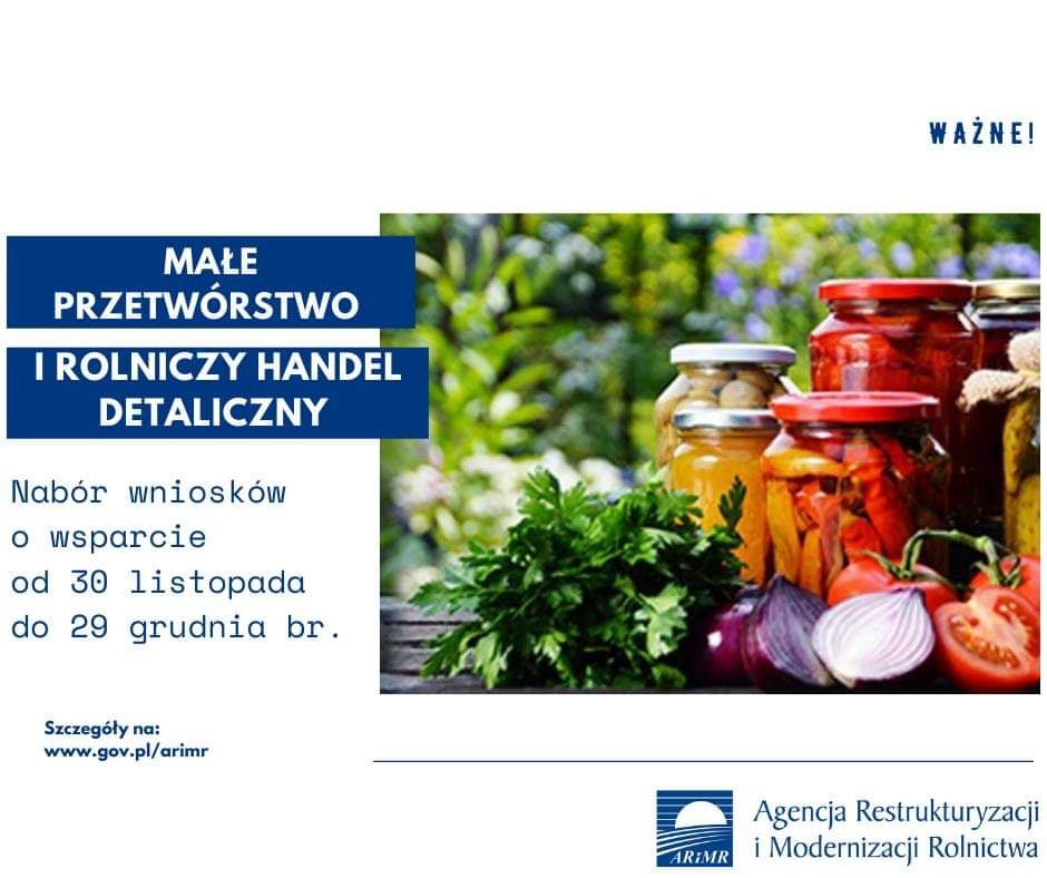 Od 30 listopada do 29 grudnia 2021 r. można ubiegać się o wsparcie na tzw. małe przetwórstwo lub rolniczy handel detaliczny (RHD).