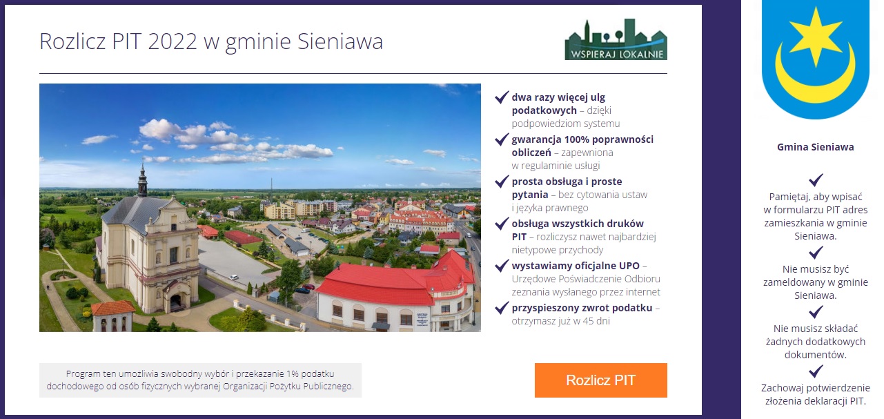 Miasto i Gmina Sieniawa przystępuje do programu Wspieraj Lokalnie. Jest to program, który poprzez aplikację pozwala w prosty sposób rozliczyć roczne zeznanie podatkowe PIT, z możliwością przekazania 1% podatku dla wybranej przez państwa organizacji z terenu Miasta i Gminy Sieniawa.