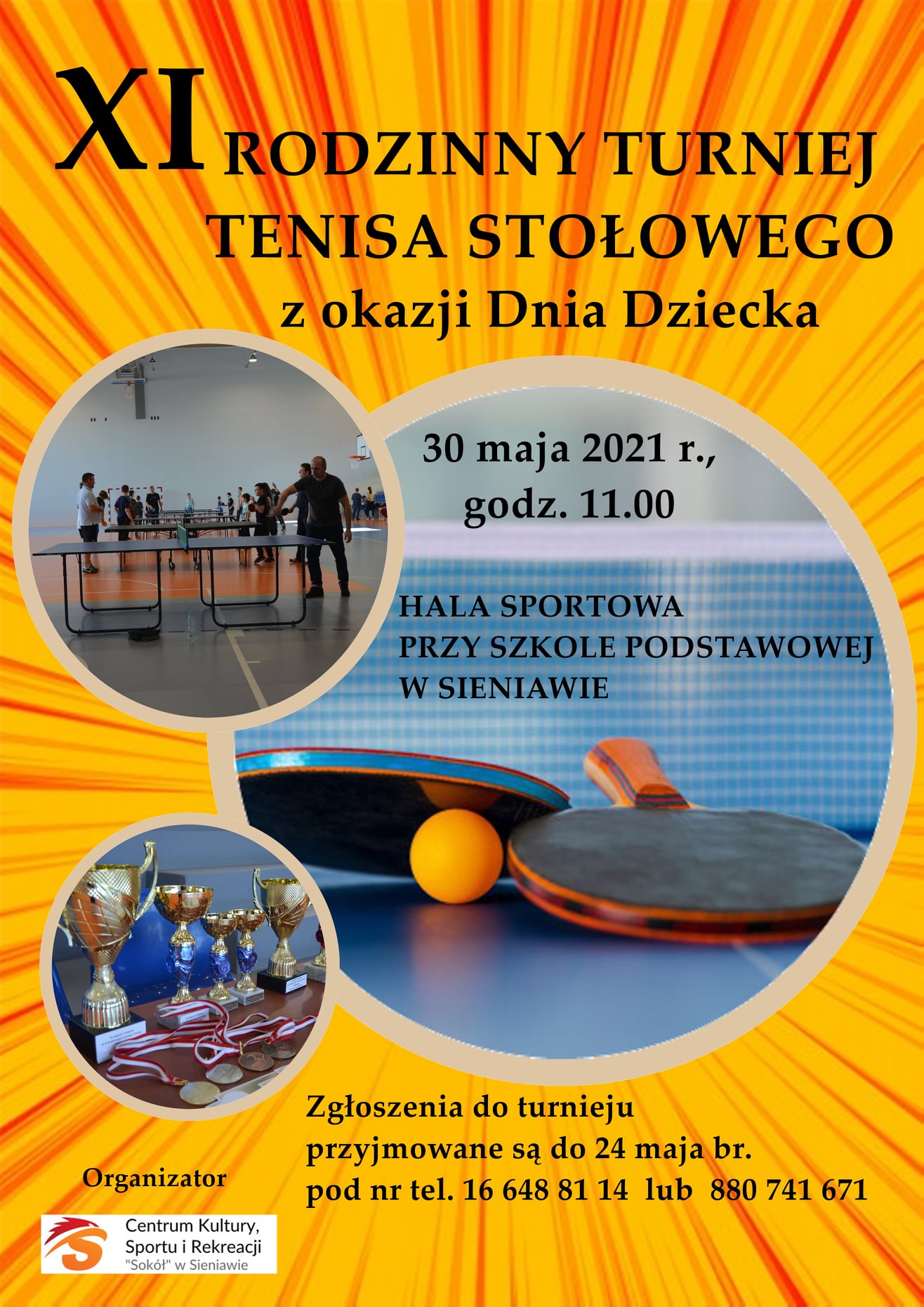 Centrum Kultury, Sportu i Rekreacji "Sokół" w Sieniawie zaprasza dzieci ze szkół podstawowych z terenu miasta i gminy Sieniawa oraz ich rodziców do udziału w XI Rodzinnym Turnieju Tenisa Stołowego, który odbędzie się 30 maja br. w nowej hali sportowej przy Szkole Podstawowej i. T. Kościuszki w Sieniawie.