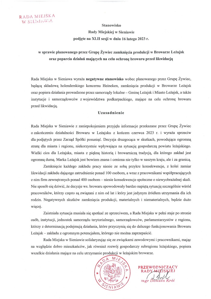 Rada Miejska w Sieniawie przyjęła jednogłośnie stanowisko w sprawie planowanego przez grupę Żywiec zamknięcia produkcji w Browarze Leżajsk oraz poparcia działań mających na celu ochronę browaru przed likwidacją.