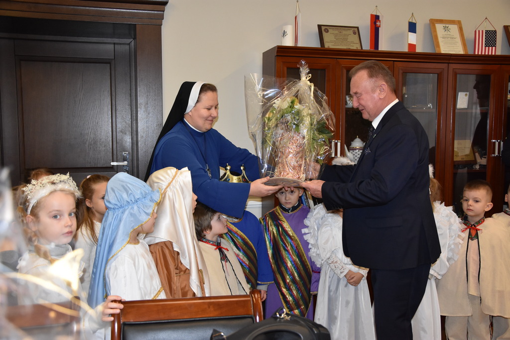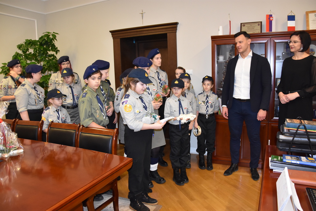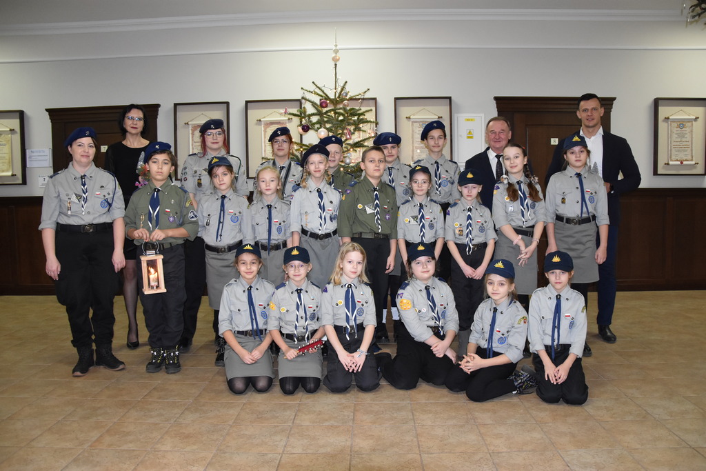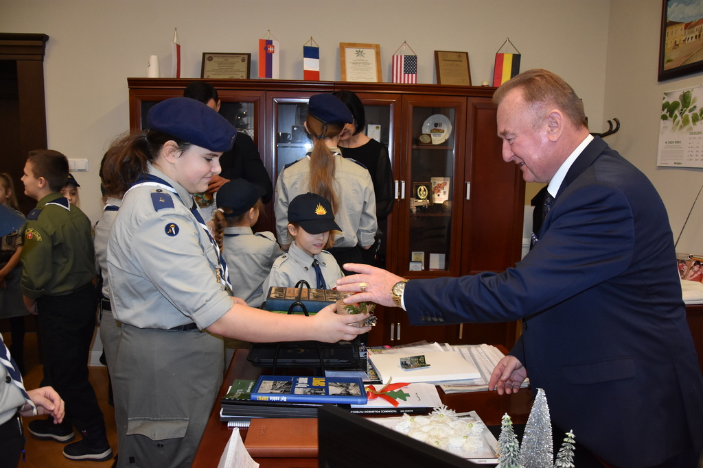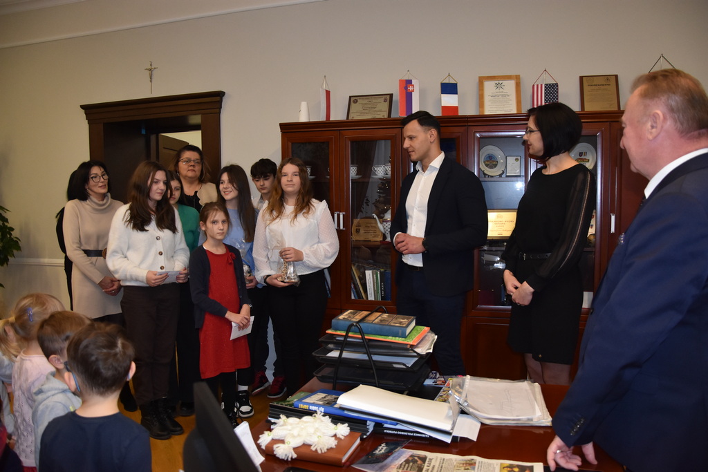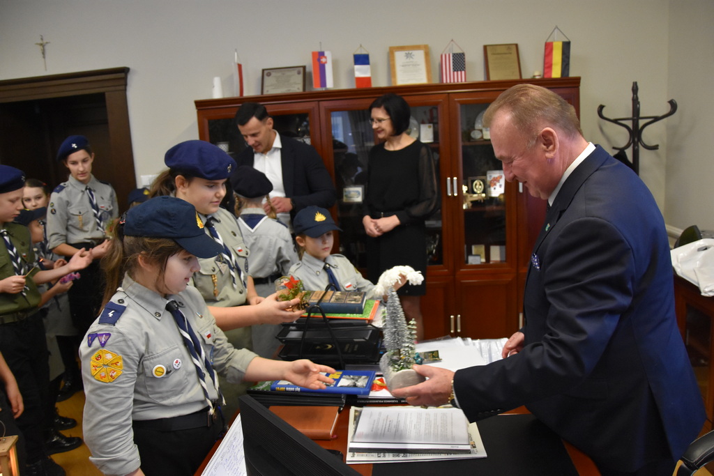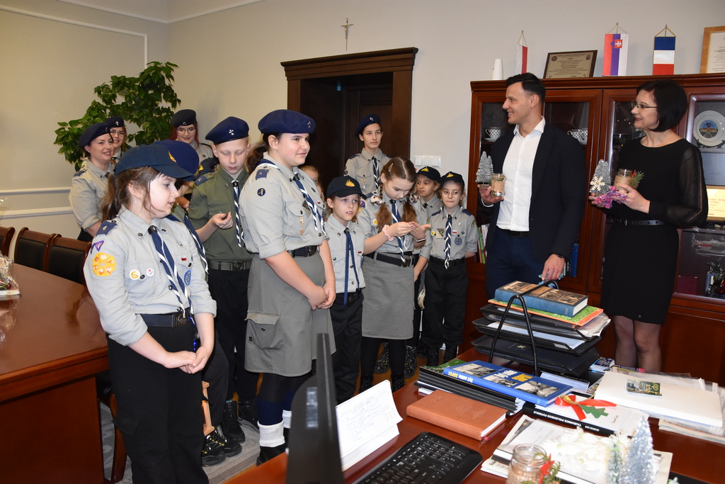 Z życzeniami świątecznymi, kolędą i pięknymi upominkami 20 grudnia 2023 r. przybyli do Urzędu Miasta i Gminy w Sieniawie wyjątkowi goście - dzieci z placówek oświatowych z terenu Miasta i Gminy Sieniawa, harcerze z 4. DH "Sokoły" - którzy przynieśli Betlejemskie Światło Pokoju, uczestnicy Środowiskowego Domu Samopomocy w Sieniawie z opiekunami oraz panie dyrektorki ze szkół podstawowych i miejskiego przedszkola. Spotkał się z nimi Burmistrz Miasta i Gminy Sieniawa Adam Woś wraz ze współpracownikami.